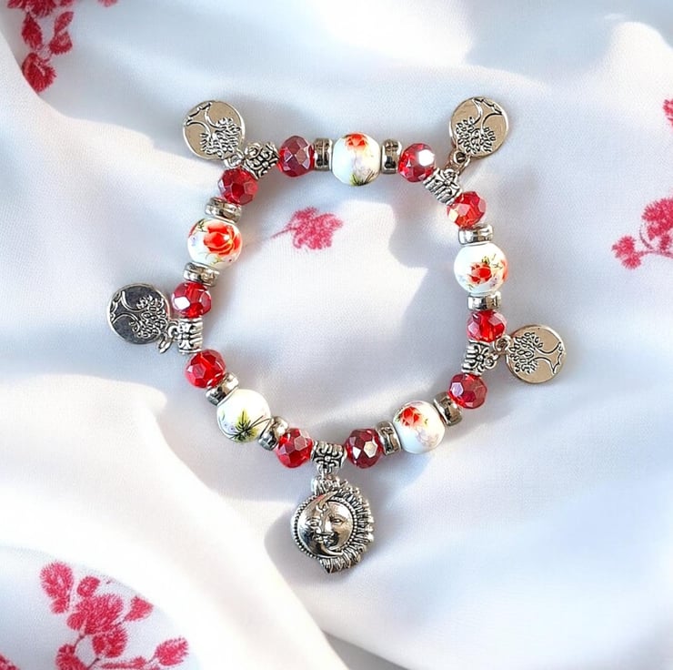 Sun and moon metal charm, with smaller tree of life charms on a strong stretchy bracelet, with a selection of red faceted crystal beads, metal and ceramic beads
