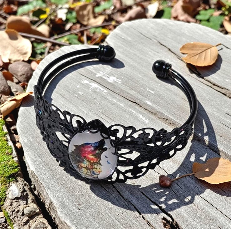 A mystical colourful wolf cabochon on a black filigree metal bangle
