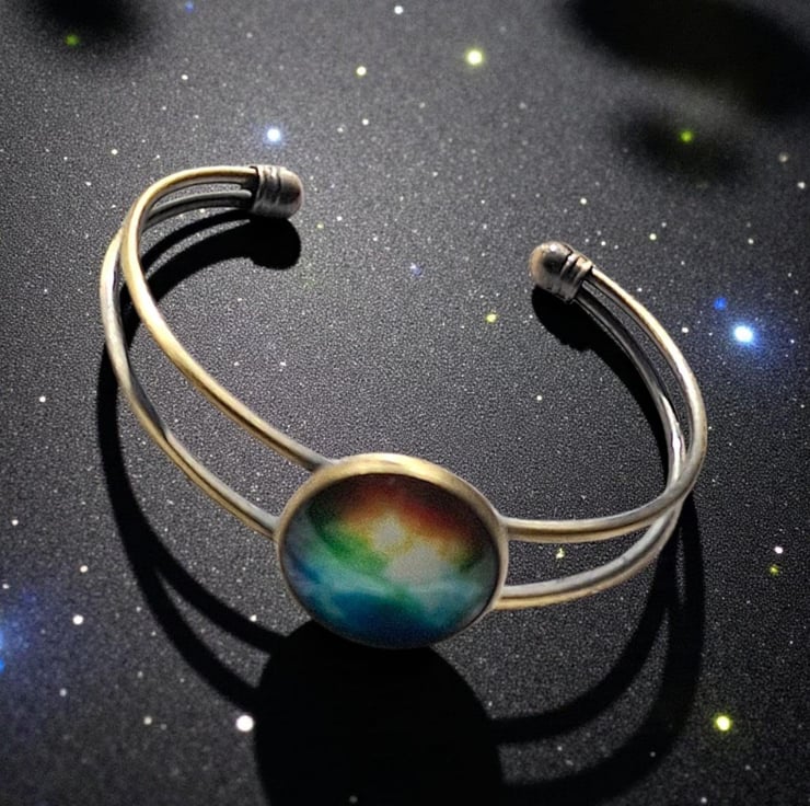 colourful, mystical universe glass cabochon on a bronze bangle