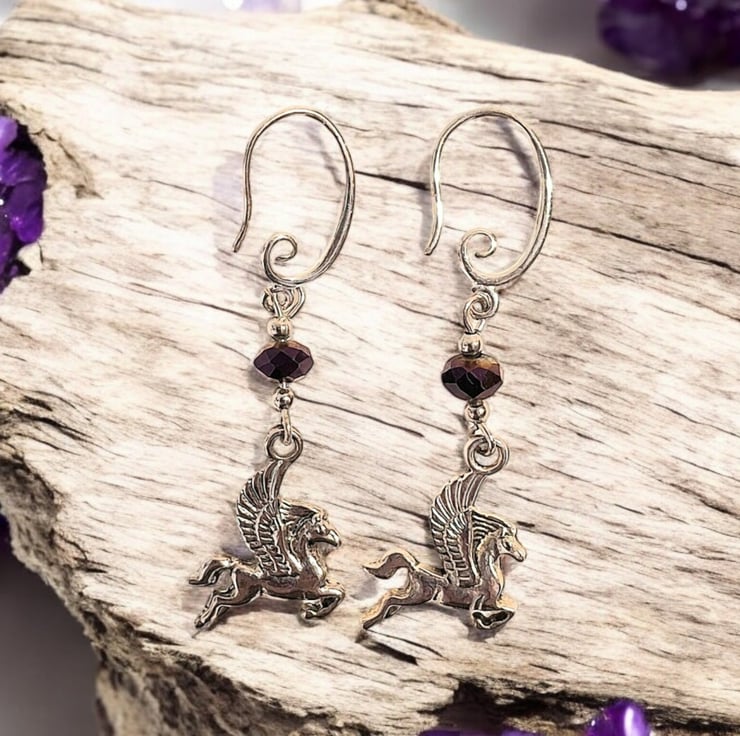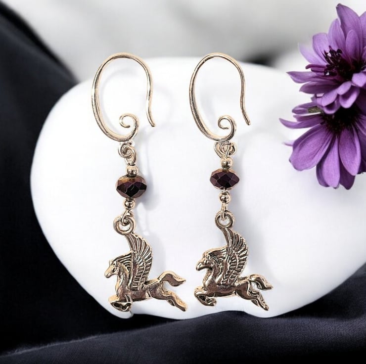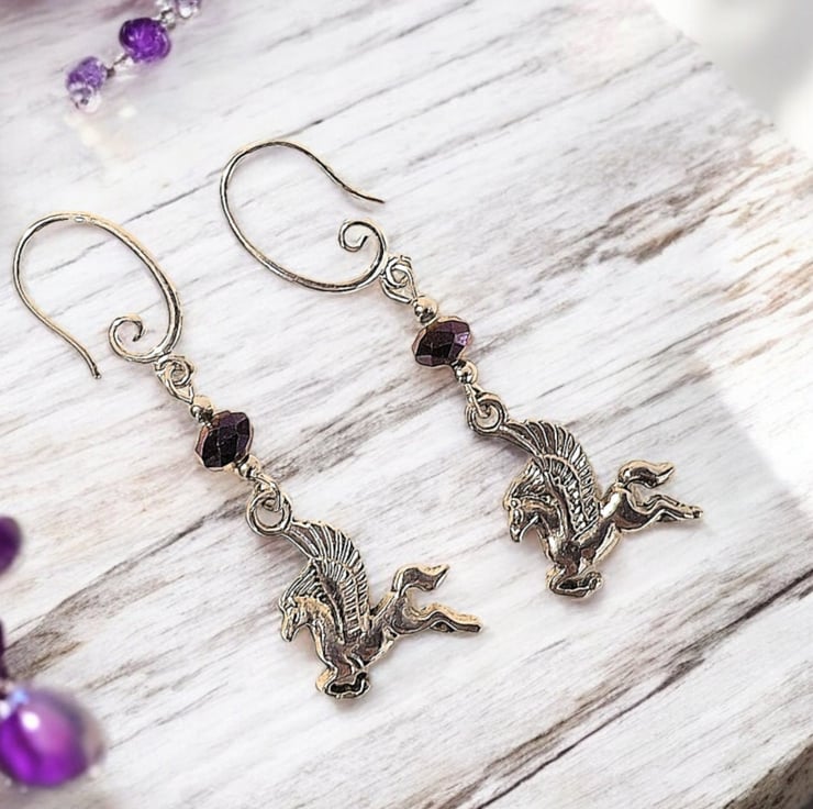 Pegasus the legendary immortal flying horse from Greek mythology. Paired here with a metallic purple crystal, and hanging from a curled Stirling silver ear wire. The Pegasus charm is 20mm high and 16 mm wide.