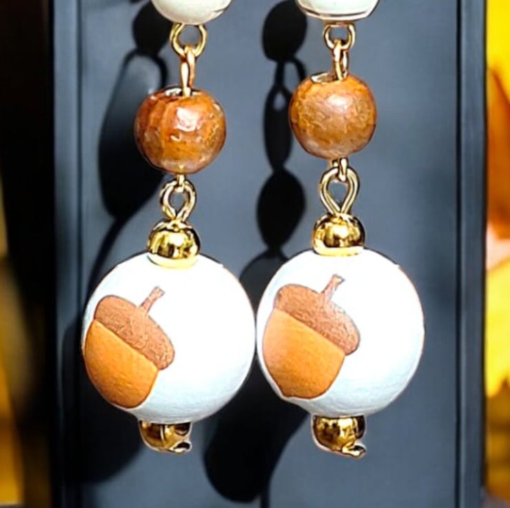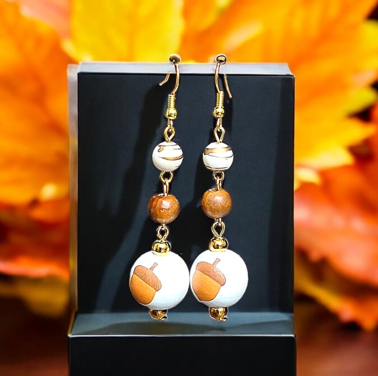 Autumn acorn design earrings, one off design. Made from sustainable wood beads. 16 mm large bead, 10mm medium bead and 6 mm small bead. They have a drop of 70mm including the earwire
