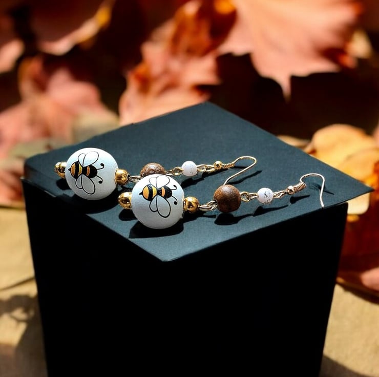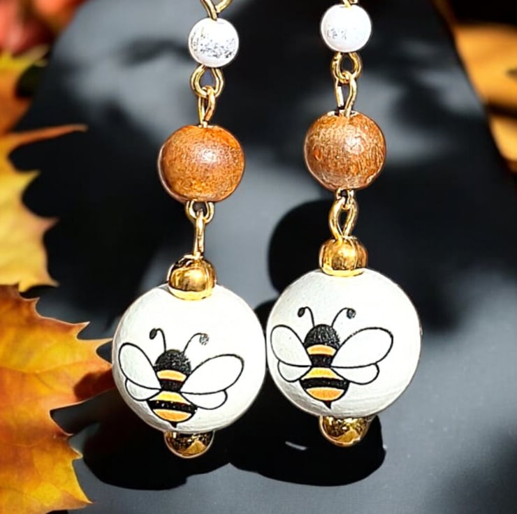Sweet bee earrings. Made from sustainable wood beads. 16 mm large bead, 10mm medium bead and 6 mm small bead. They have a drop of 70mm including the earwire