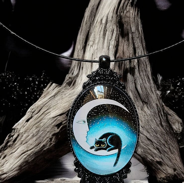 A black cat lazing in the night's crescent moon. A large glass cabochon -