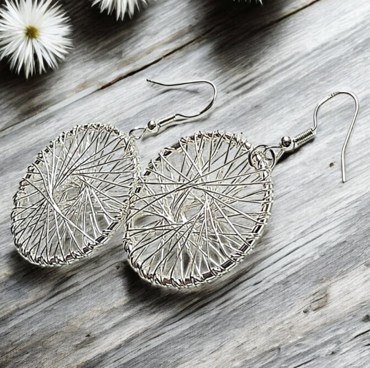 A single piece of silver plated wire consistently wrapped to create a dream catcher style pendant