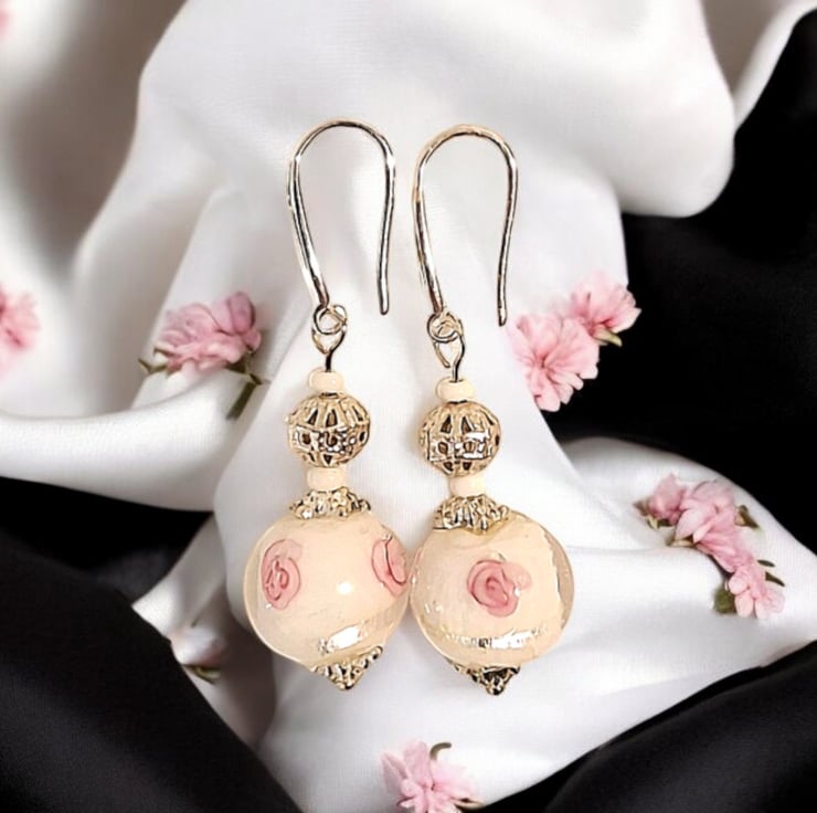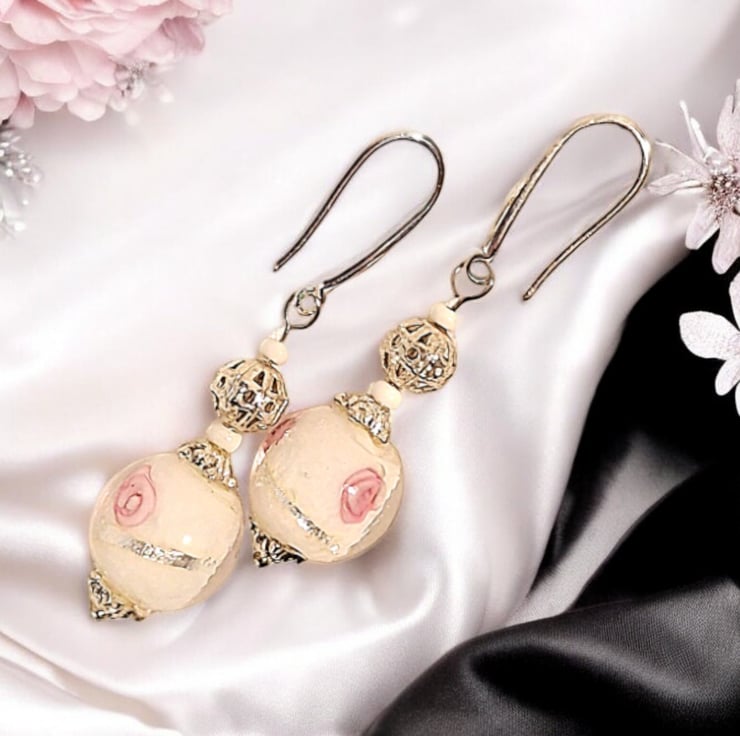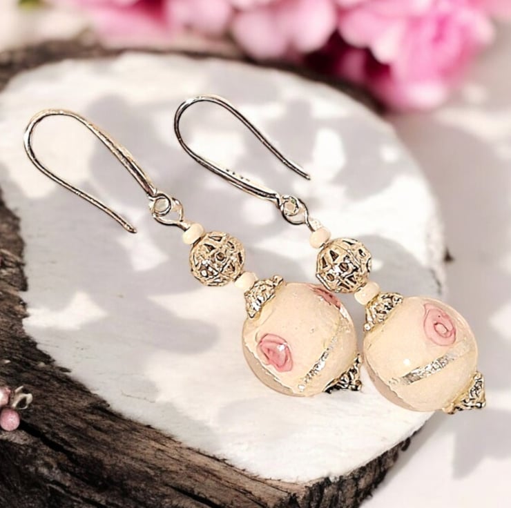 Delicate Roses and silver thread lampwork glass beads, hanging on Stirling silver ear wires