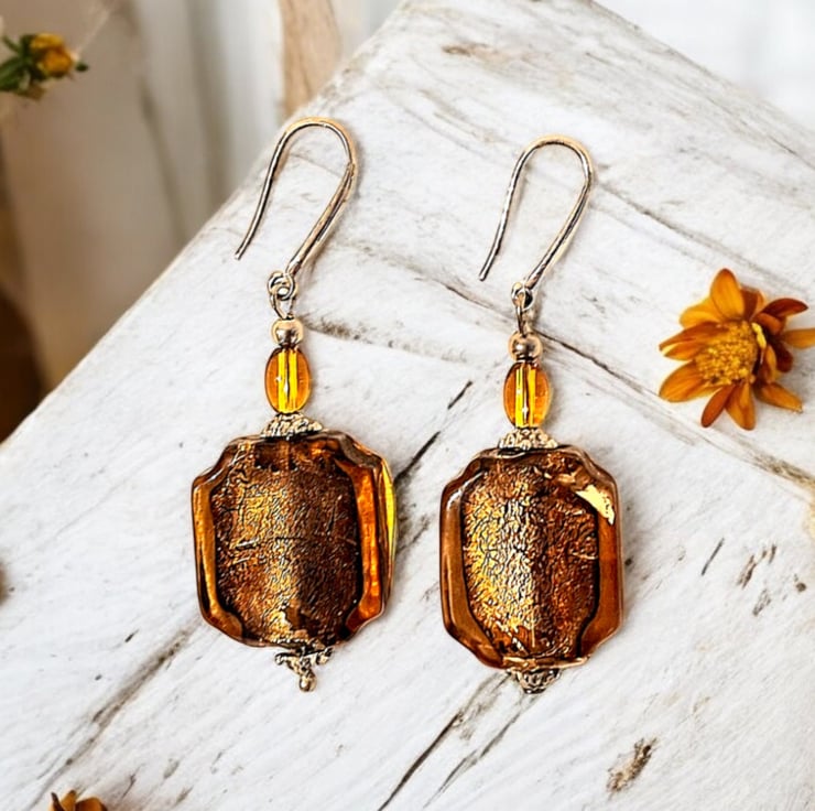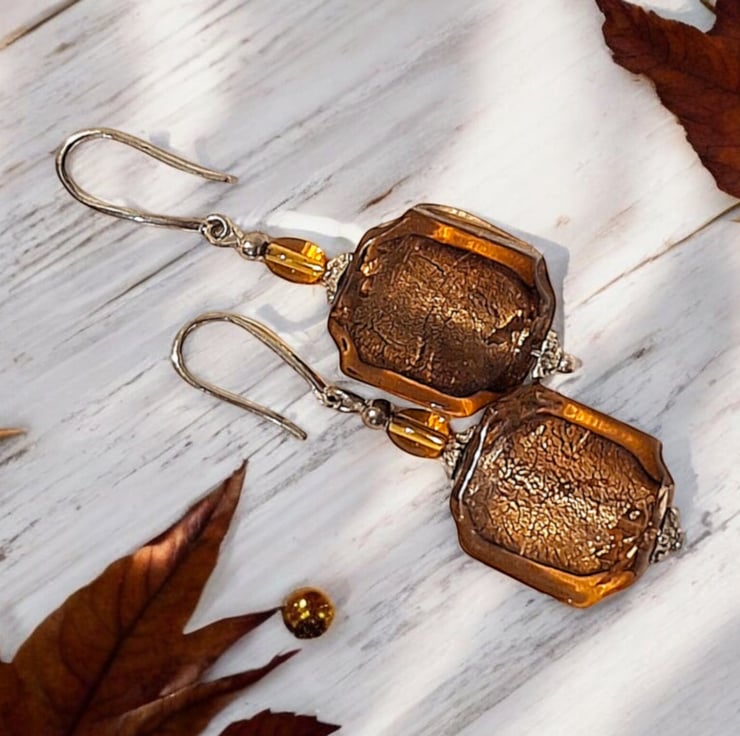 Amber coloured glass with silver lining. A lovely octagonal shape. They hang on Stirling silver ear wires