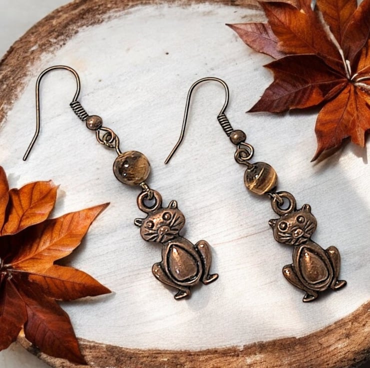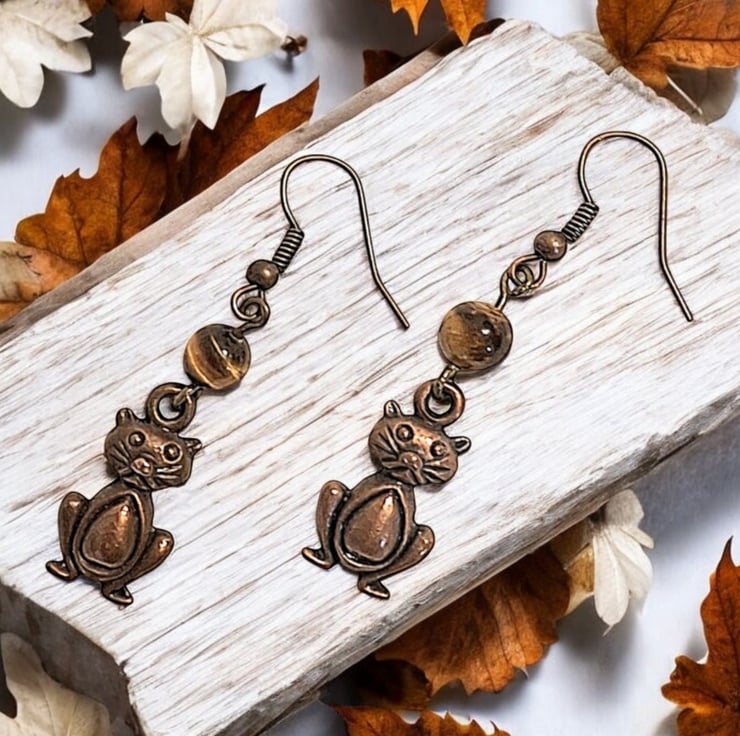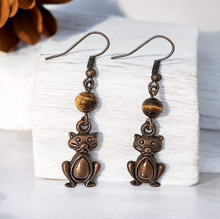 Rustic bronze cat earrings, with semiprecious Tigerseye stone beads. Hanging on anti allergy bronze ear wires
