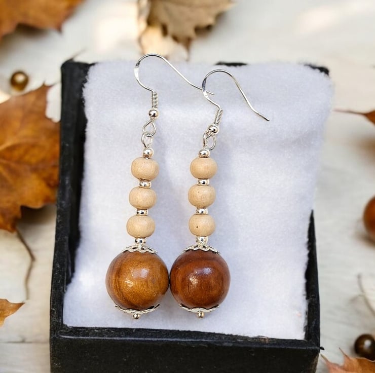 Made from sustainable wooden beads with stirring silver ear wires. The larger bead is 12mm wide and the smaller ones are 6mm wide. Th hanging length is 40mm