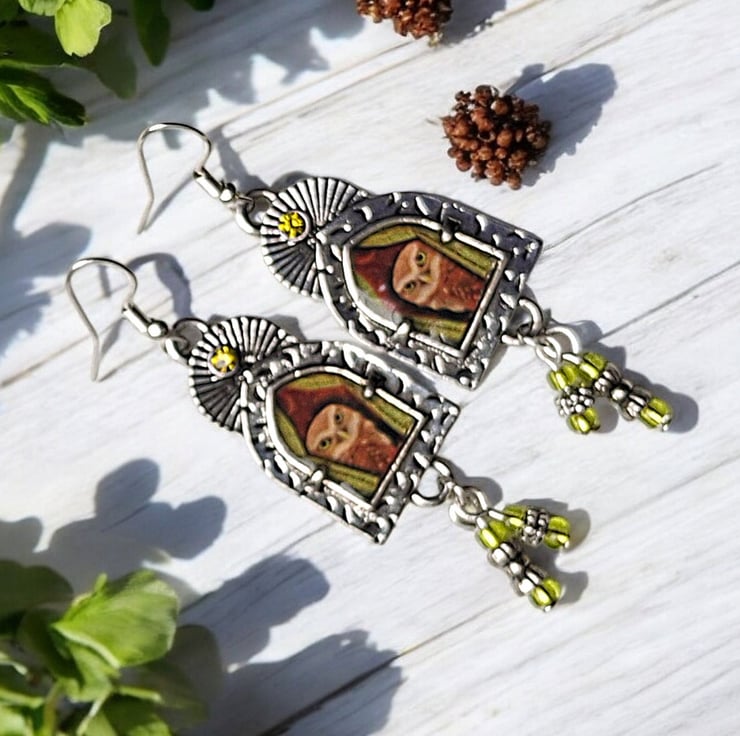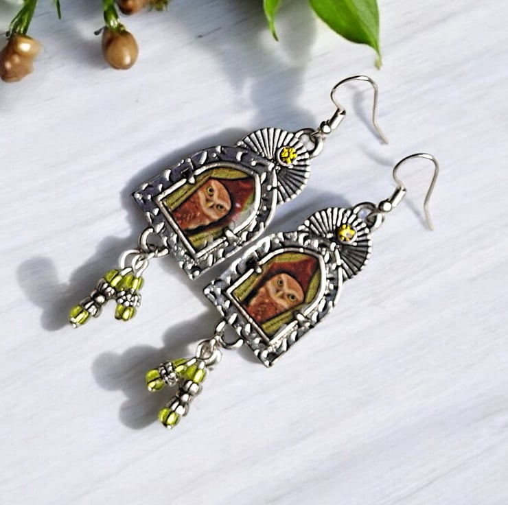 Pretty 'picture' earrings. Owls peeking through windows. 55mm drop, the owl picture is 30mm high and 18mm wide