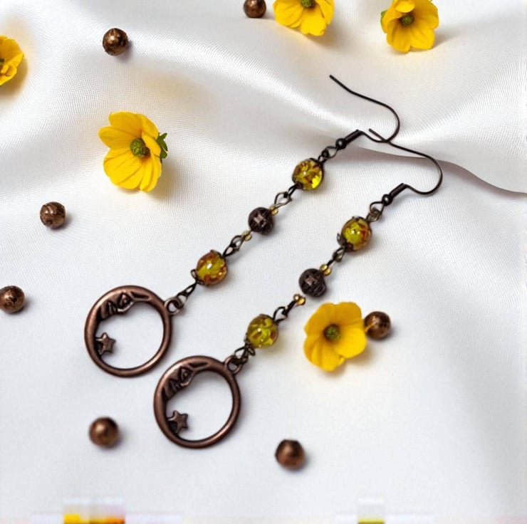 Cute 12mm bronze smiling moon charm with a little star and fire beads. They hang 30mm down