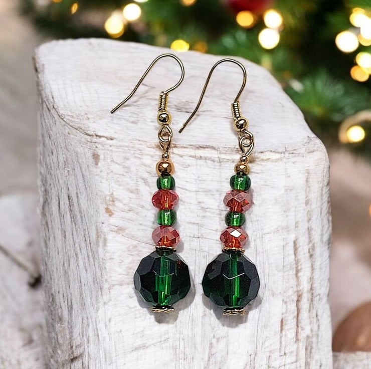 Deep green 10mm glass beads co-ordinated with pretty AB red crystal beads, on gold plated ear wires, the drop length is 25mm