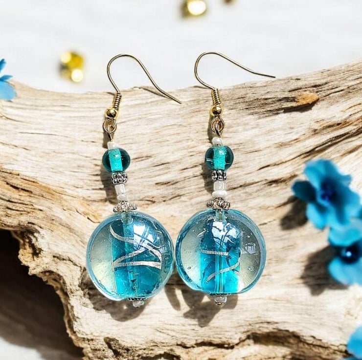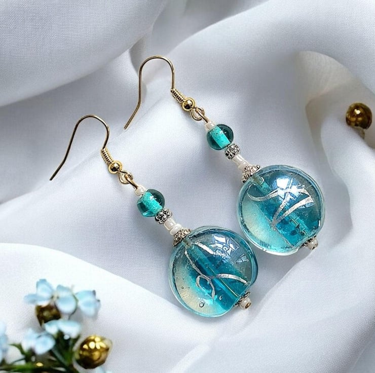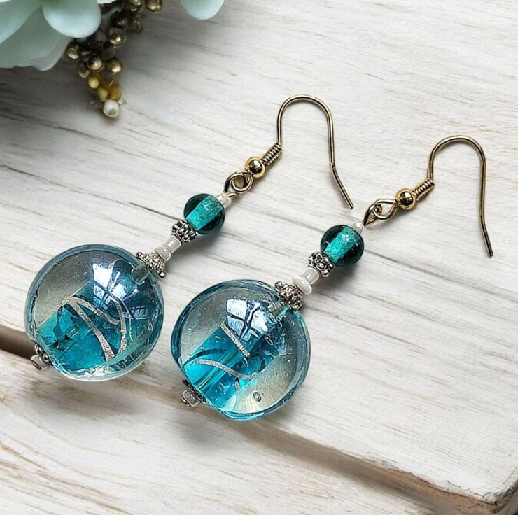 Silver thread lampwork beaded earrings, Turquoise glass, boho earrings