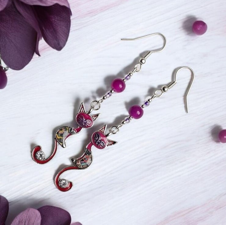 Elegant cat earrings. These have a pretty enamelled pattern. A crystal sits in the curl of its tail. The cats are 25mm long. With silver earwires