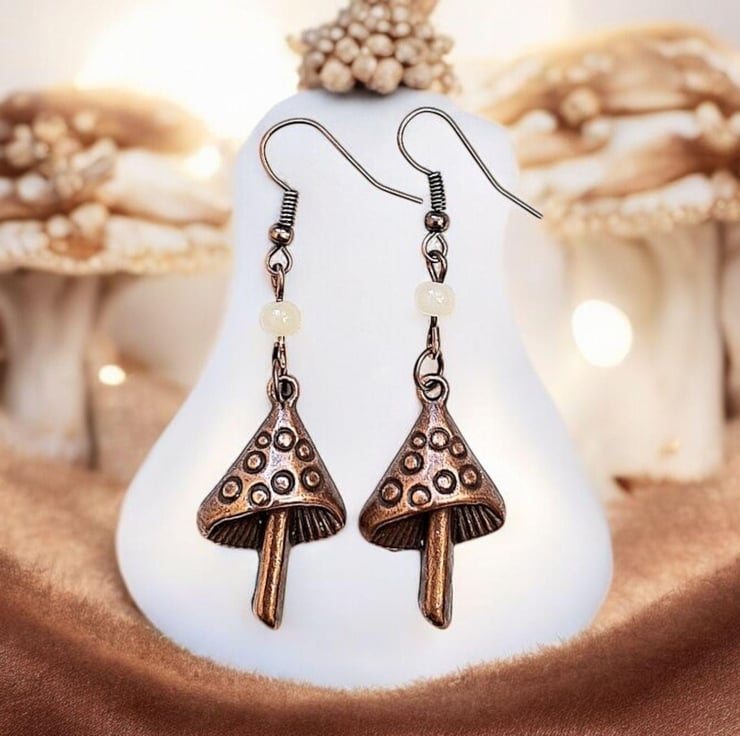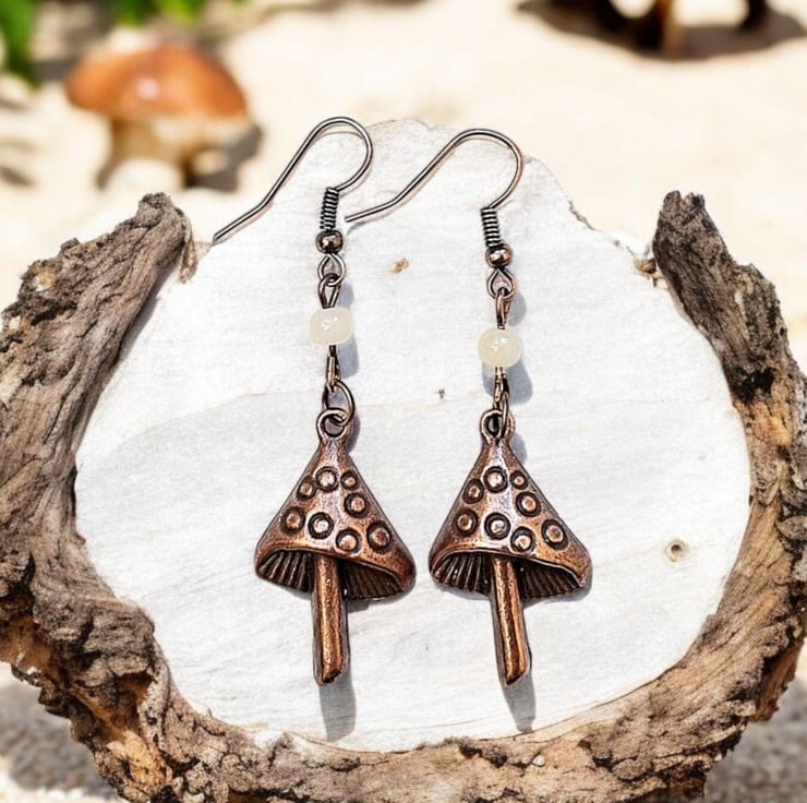 What is it about mushrooms snd toadstools that draws us in? Their connection with fantasy worlds, a world full of fairies and magic, or their earthyness, their danger, what ever it is, I love them and you'll find them all over my shop.I have opted for rustic bronze mushroom charms with this pair for a more earthy feel.