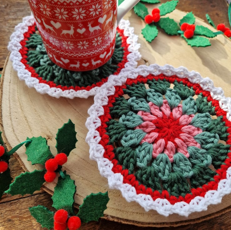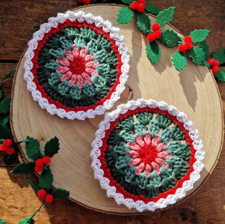 Christmas coasters in a set of 2. They make beautiful and practical Christmas decor with their traditional colour scheme, perfect for the dinner table on Christmas day! They would also make a wonderful gift to friends and family. Each handcrafted coaster is made from super soft cotton for absorbency, with a recycled white cotton border. They can be used with cold and hot drinks, and if needed, gently handwashed and air dried. (I have two Christmas coaster colourways in my shop, if you would prefer to have one of each colourway, please do send me a message.)
