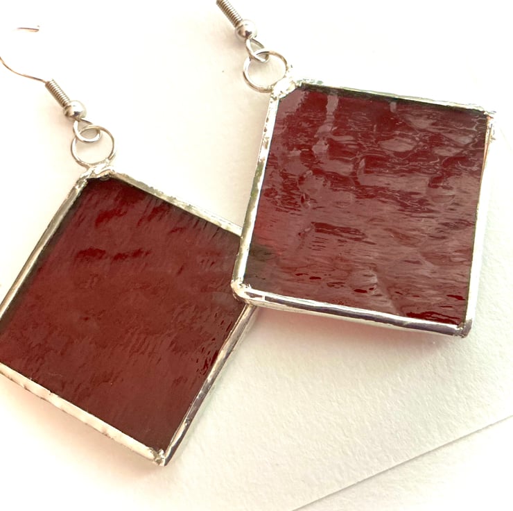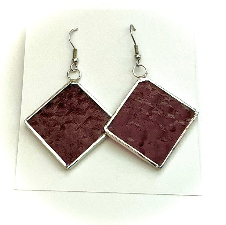 Diamond shaped stained glass earrings with a silvery surround. Textured deep Red coloured glass in a square shape, hanging from the corner to give a diamond shaped look.