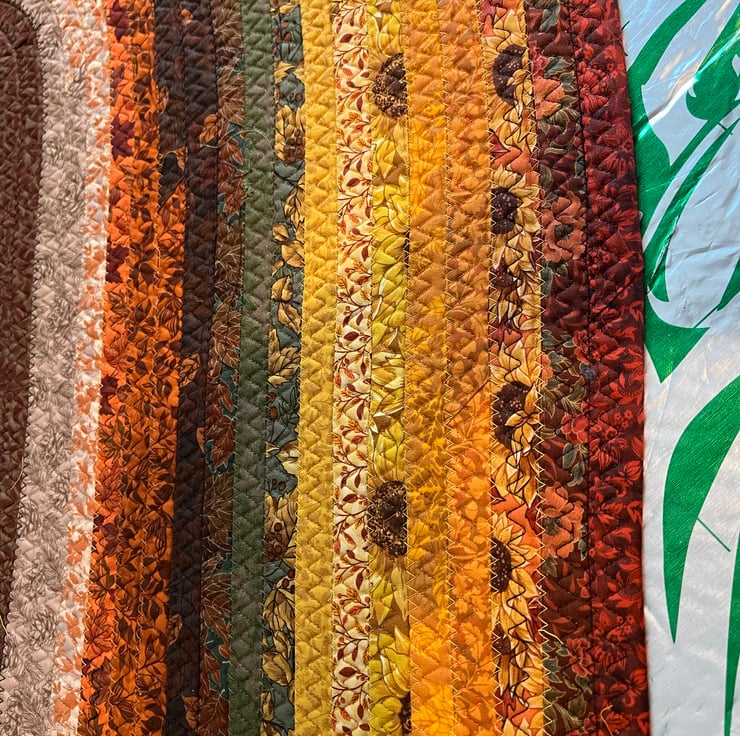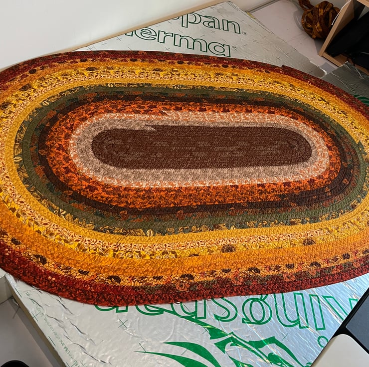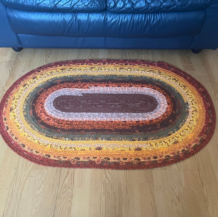 This item is a handmade jelly roll rug. It's all about the richness autumn colours with this oval shaped rug measuring approx 28" x 44".