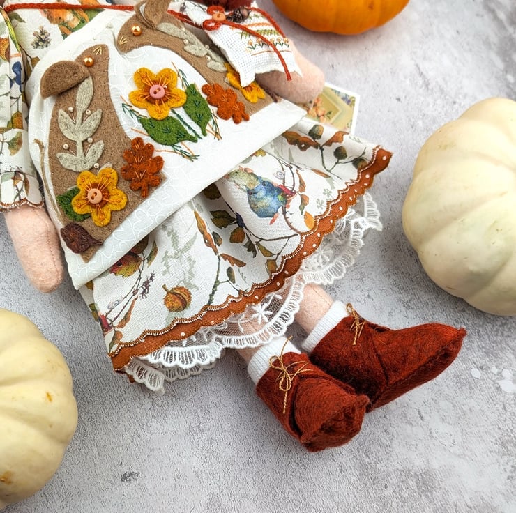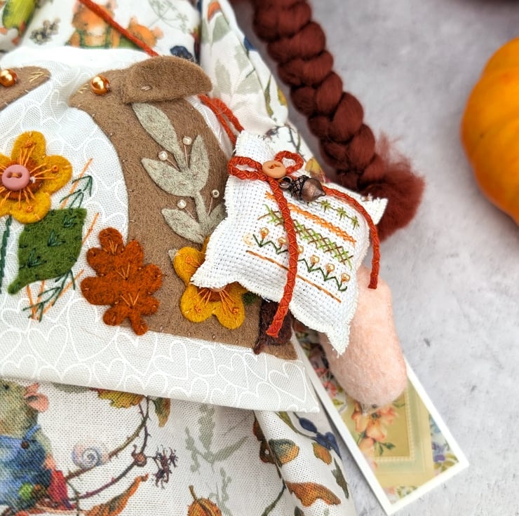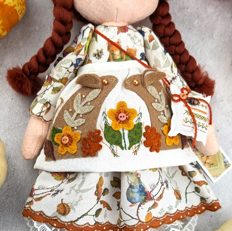 Beneath her dress she has broderie anglais drawers with tiny cotton socks and wool felt boots. Her petticoats are a rust dot cotton with white tulle lace. Her apron is heavily hand embroidered with a folk art pattern of Hunca Munca and Tom Thumb from the Tale of Two Bad Mice. She is finished with tiny buttons and a sampler pillow