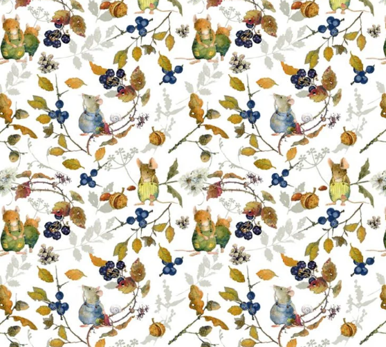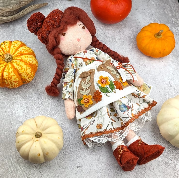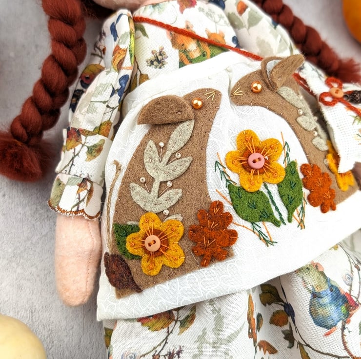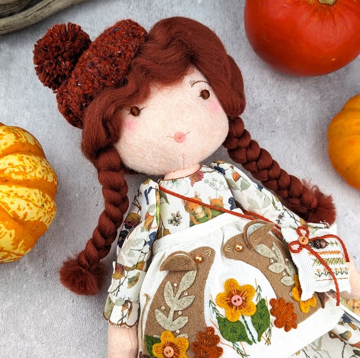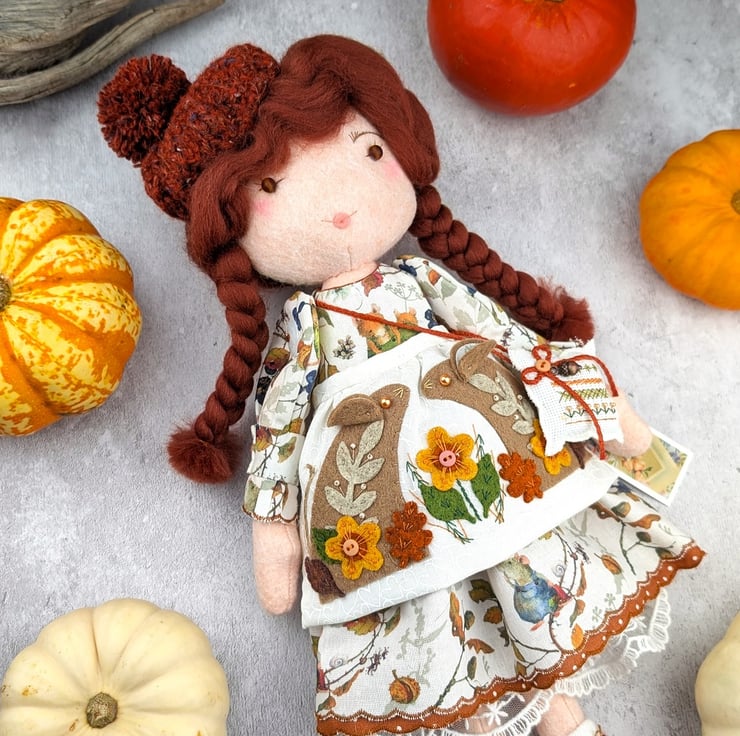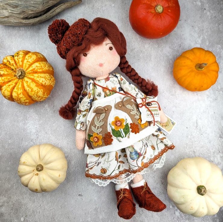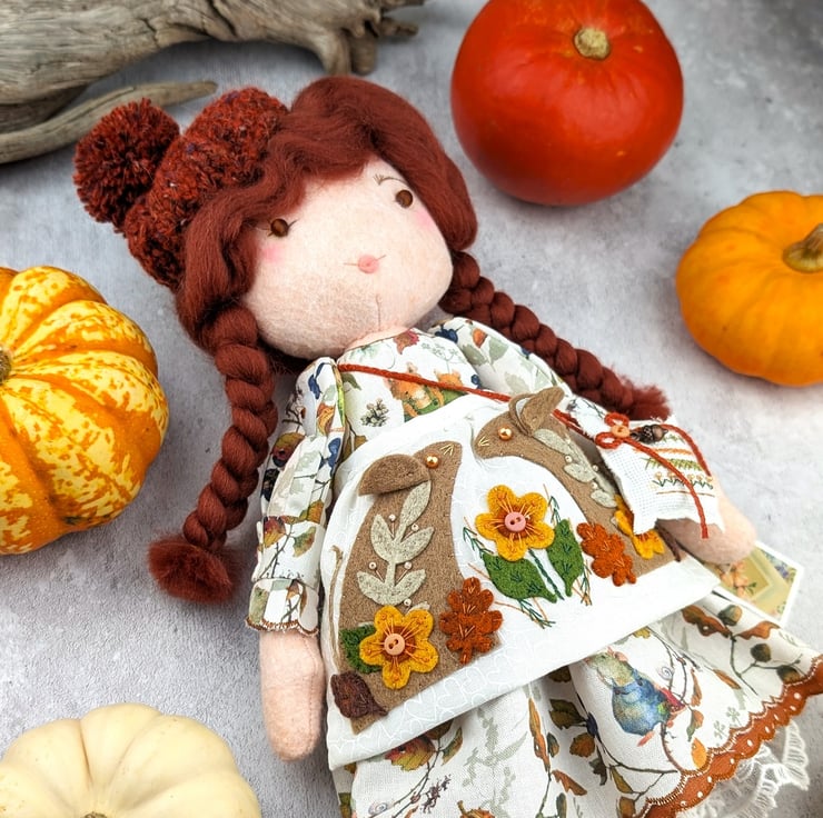 This little doll is Beatrix and the Tale of Two Bad Mice. She is made from quality wool felt with frosted glass bead eyes and rust red wool roving for hair. Her facial details are hand embroidered and her hair is hand styled. She is dressed in an Acufactum print cotton called Hedgerow Mice and it features all kinds of autumn mice abounding across a white ground. Her bobble hat is Tweed Felt Rowan Wool.