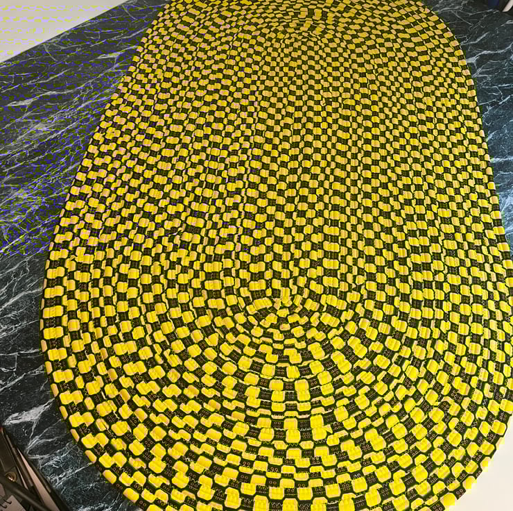 This item is a jelly roll rug made with a yellow and black waxed cotton fabric. The pattern makes for a unique effect.
