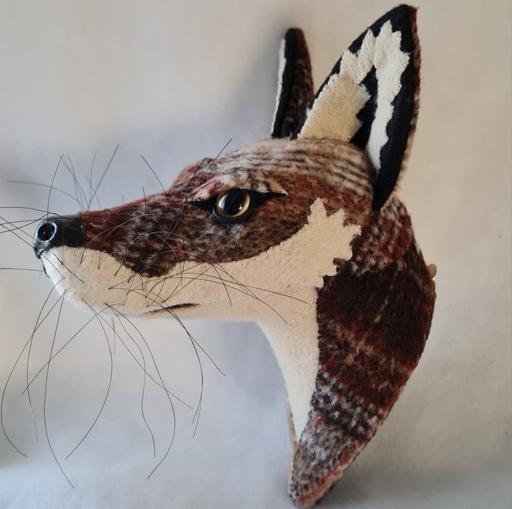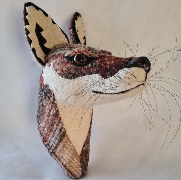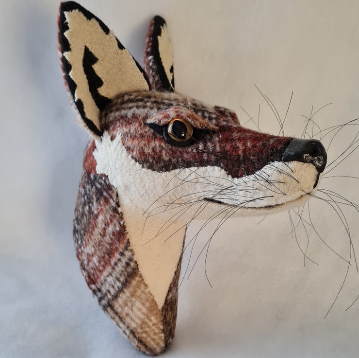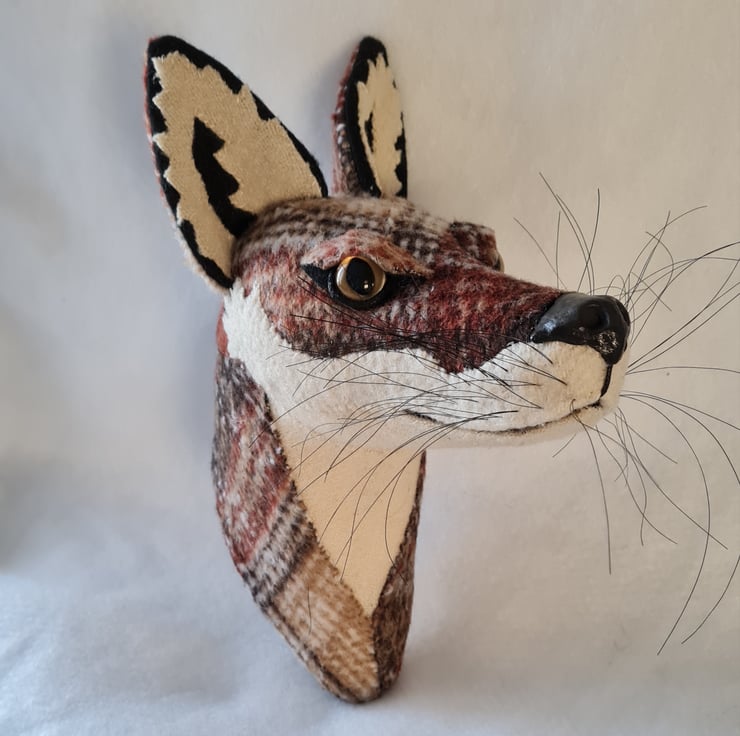 Medt Fergus : A lifesize faux fox head which I have handmade and covered in hand stitched beige, briwn and cream tweed tartan fabric. The nose is handmade from polymer clay. The head is backed with felt and has a metal hanger to hang it on the wall. It is lightweight.
