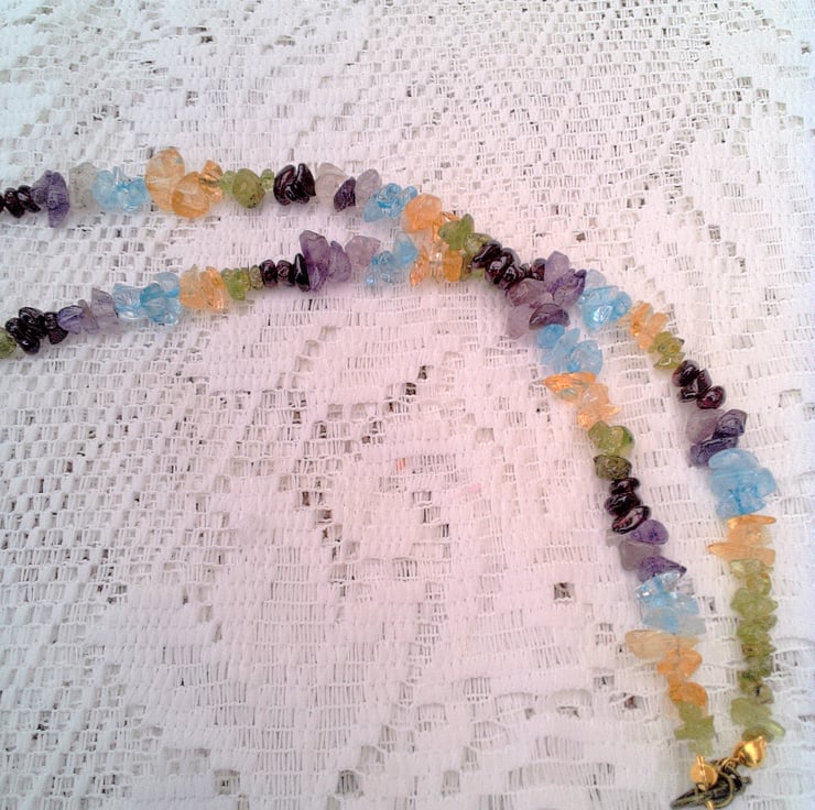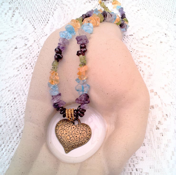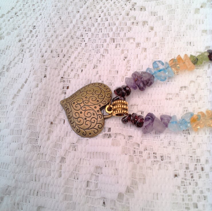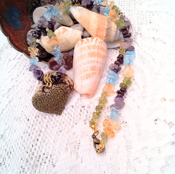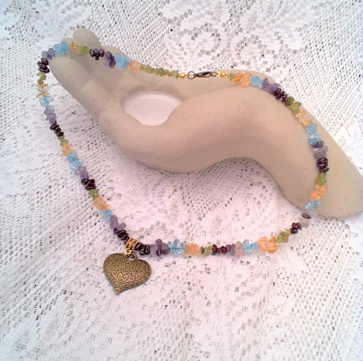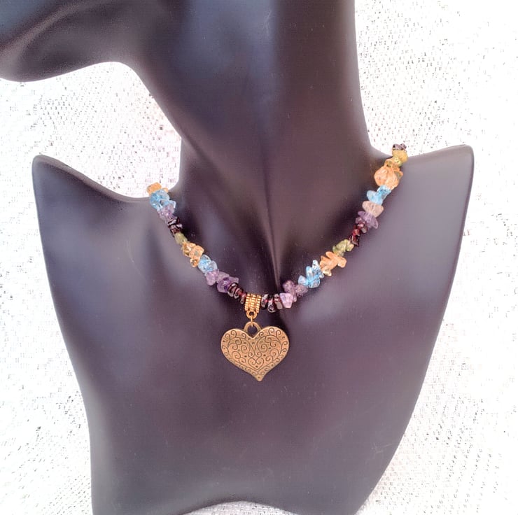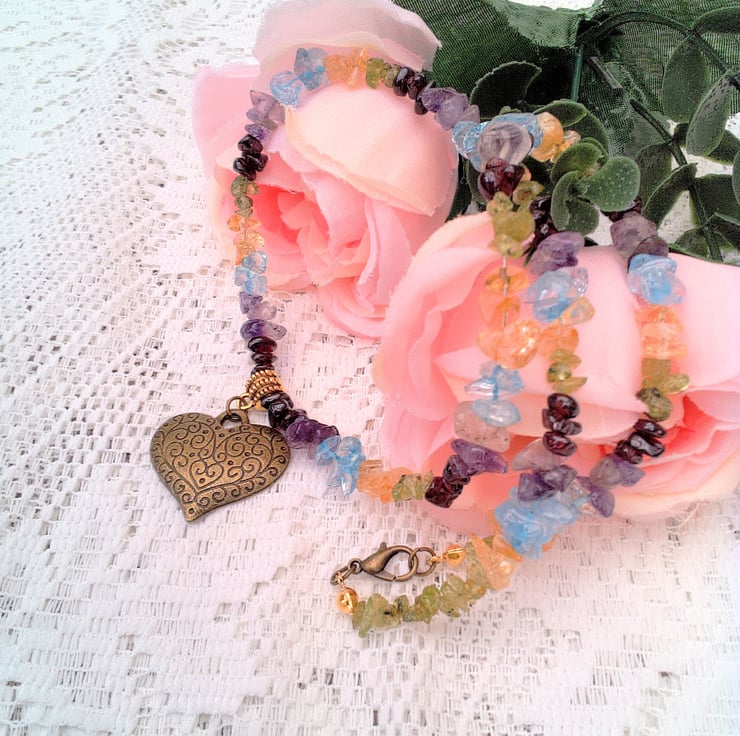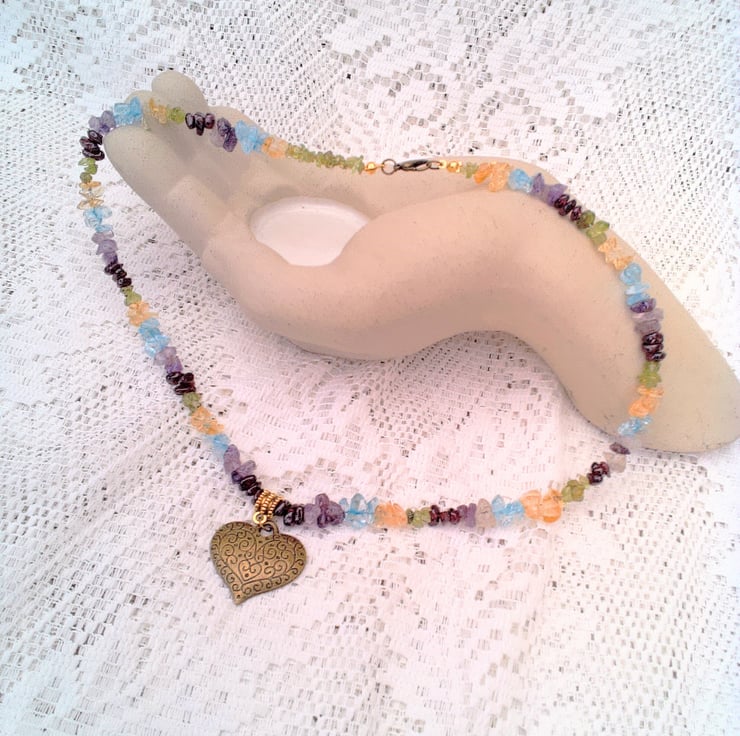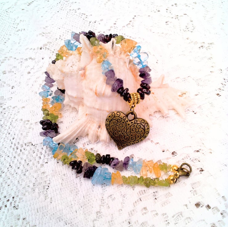 This pretty mixed gemstone chip bead necklace with a bronze heart charm pendant would look great with any outfit you wear for a day out or for a casual evening out. It would also make a lovely gift for a friend or relative for a birthday, anniversary or Christmas, for a stocking filler or a Secret Santa, it would also be a lovely treat for yourself. It is made using medium to small gemstone chip beads, These include amethyst, peridot, citrine, garnet and aquamarine. The necklace is finished with a 20 mm x 25 mm bronze plated heart charm at the centre. It measures 18.5 inches (47 cm) with a drop of 1 inch (2.5 cm) for the heart charm. The necklace will be dispatched wrapped in tissue paper in an organza bag and delivered to you via Royal Mail first class post