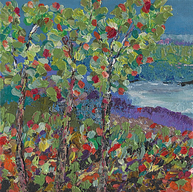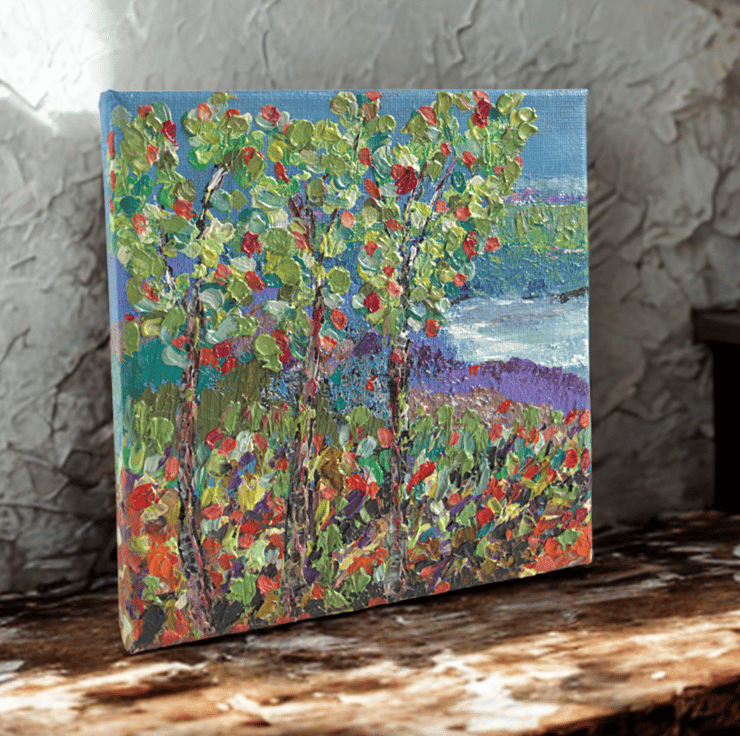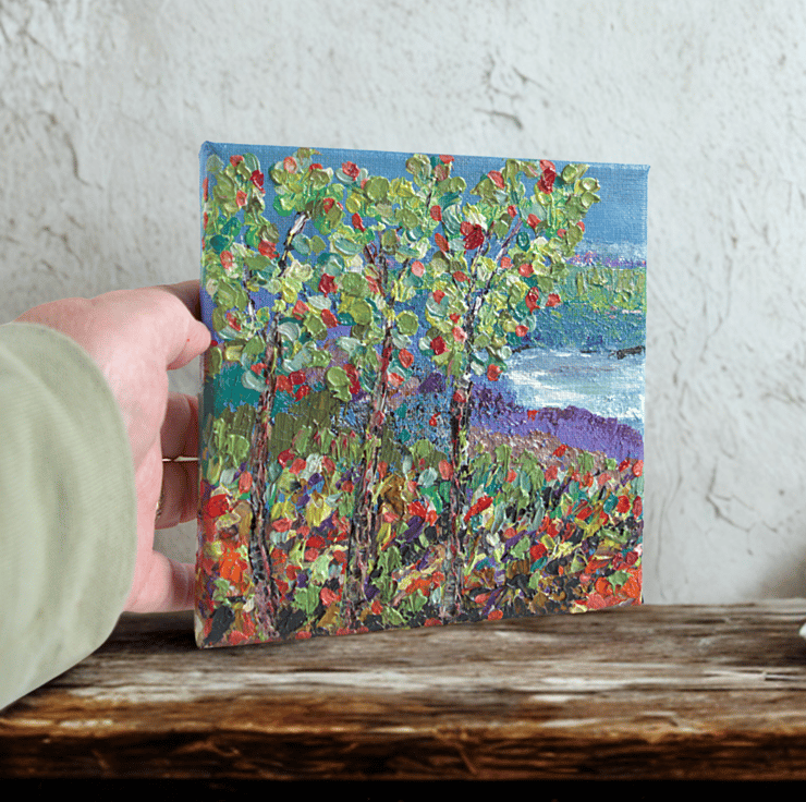 This small oil painting captures the beauty of changing seasons, with the trees in full colour and a serene loch in the distance. This original impasto painting has been completed using a range of knives and my fingers. It has been completed on a cradled canvas, which gives durable support. It is ready to hang on your wall to bring a piece of Scotland into your home.