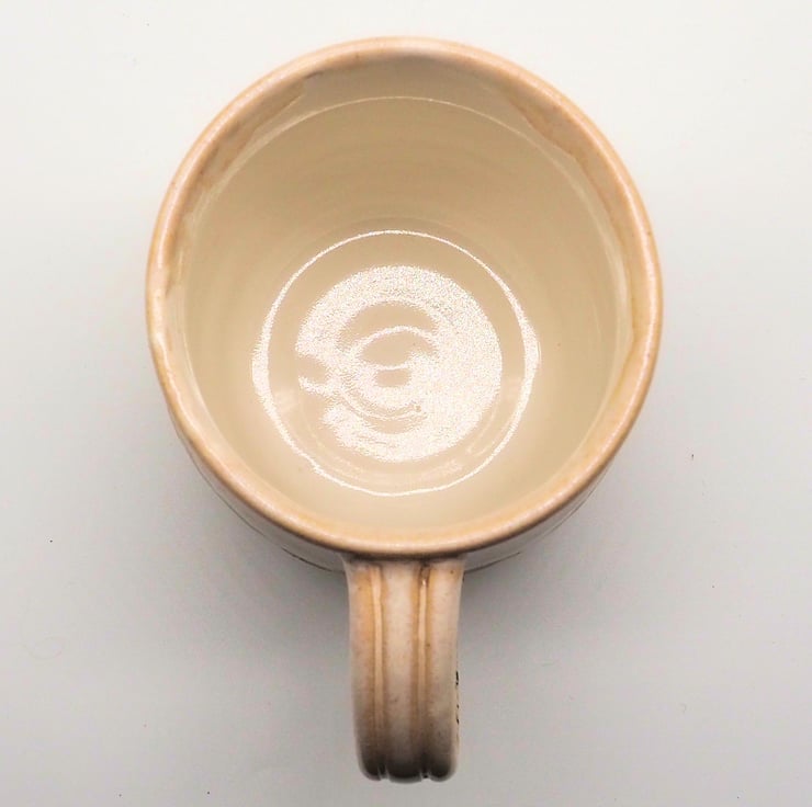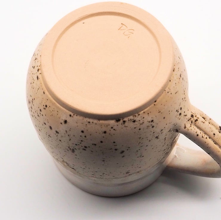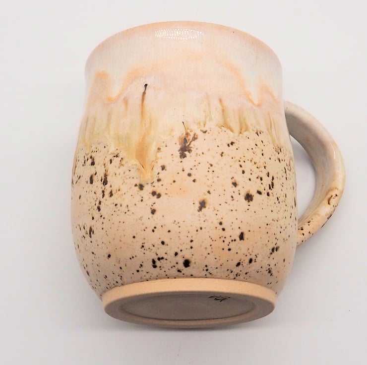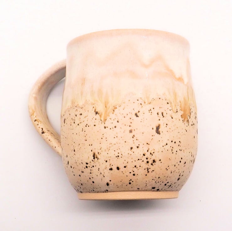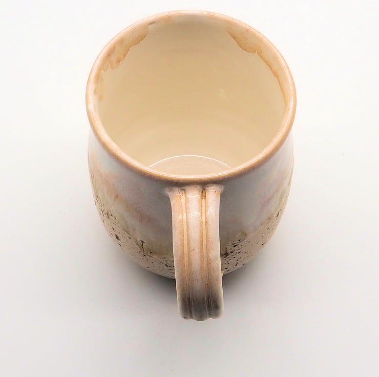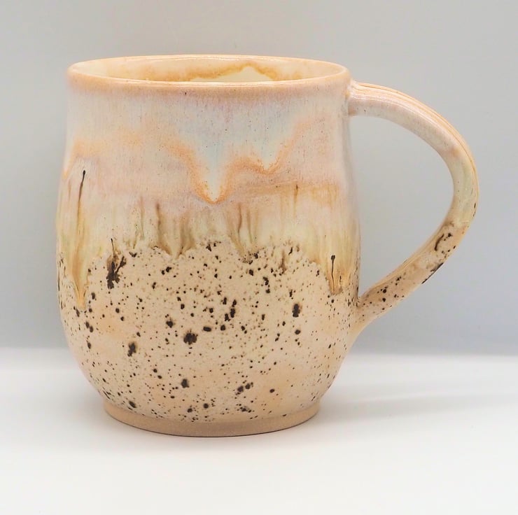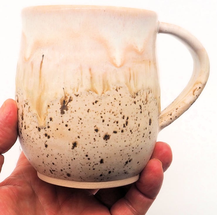 Large coffee, tea or hot chocolate mug. Hand thrown on my potters wheel and glazed in a multi-coloured brown flecked cream satin glaze. Inside glazed in glossy white.