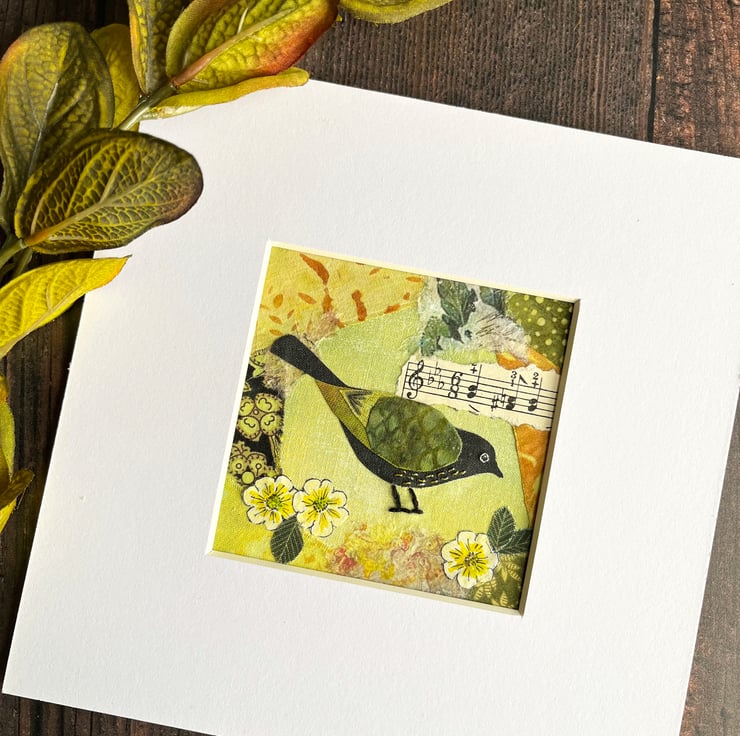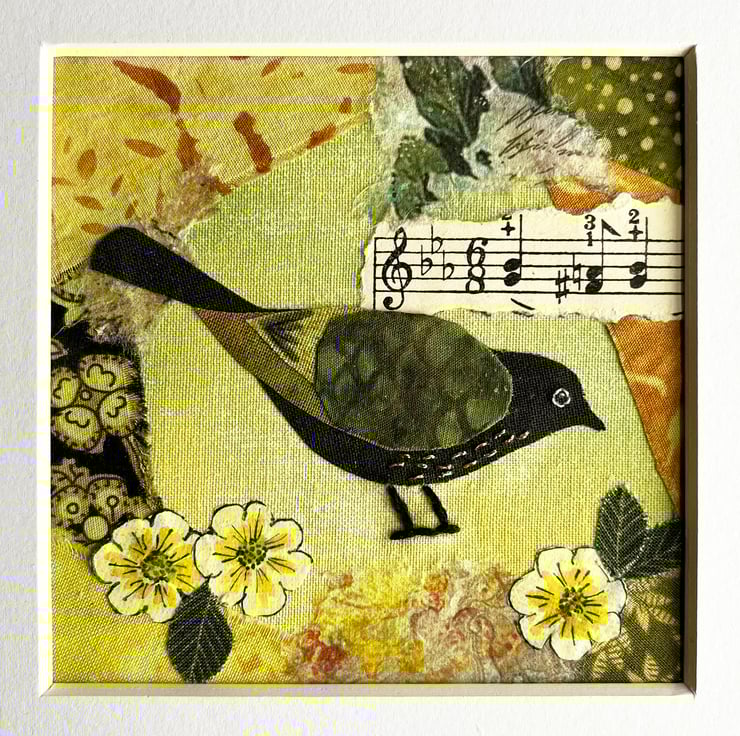 The picture has been made using layers of cotton fabric (many of them batik) and decoupage papers. The fabrics have been intentionally frayed to give a soft edge. The bird is made using black cotton and has a decorative wing made with layered fabrics. I've added some metallic embroidery threads to give a bit of sparkle. There is a strip of music from a vintage music sheet and the flowers have been drawn onto calligraphy paper before being cut out and added to the collage.