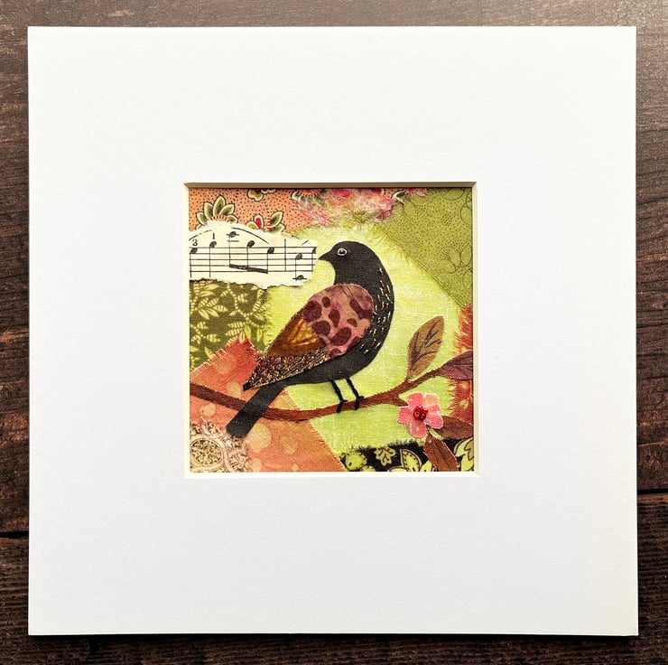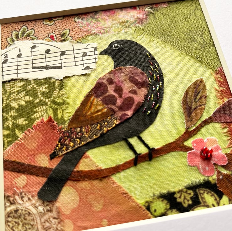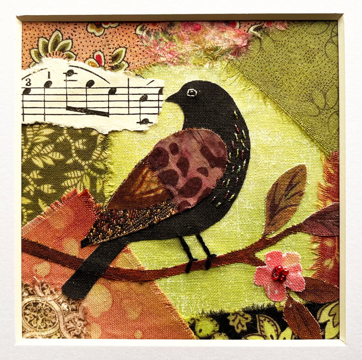 The picture has been made using layers of cotton fabric (many of them batik) and decoupage papers. The fabrics have been intentionally frayed to give a soft edge. The bird is made using black cotton and has a decorative wing made with layered fabrics. I've added some metallic embroidery threads to give a bit of sparkle. There is a strip of music from a vintage music sheet and I've added a few seed beads to the centre of the blossom.