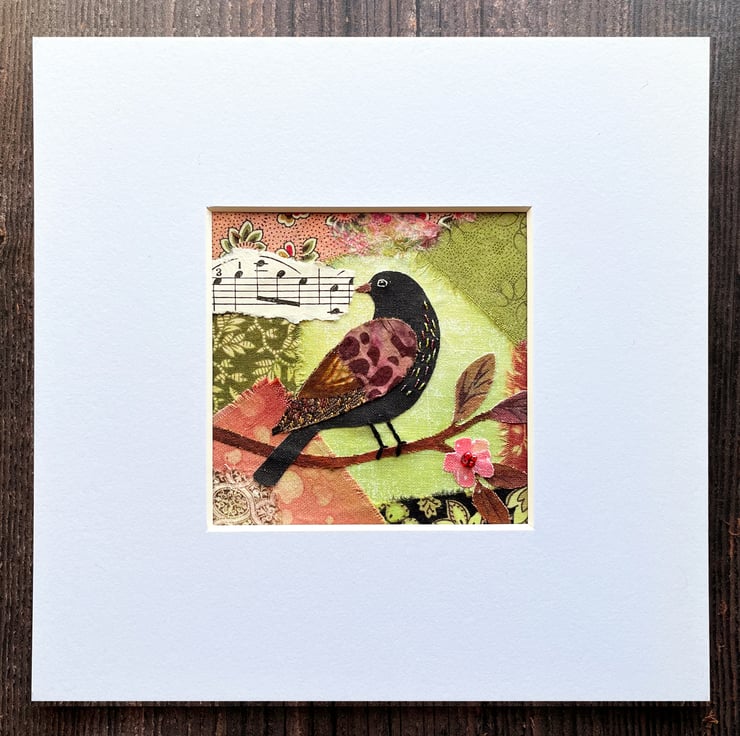 The picture has been made using layers of cotton fabric (many of them batik) and decoupage papers. The fabrics have been intentionally frayed to give a soft edge. The bird is made using black cotton and has a decorative wing made with layered fabrics. I've added some metallic embroidery threads to give a bit of sparkle. There is a strip of music from a vintage music sheet and I've added a few seed beads to the centre of the blossom.