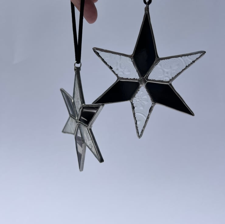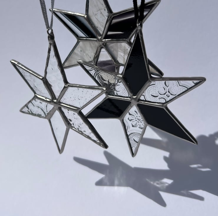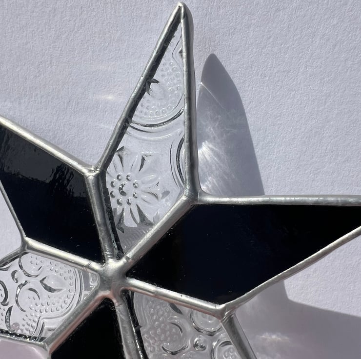 A stained glass Christmas star decoration in smoothblack opaque and a vintage-inspired pattern clear textured glass. A sophisticated sparkly decoration made to last a lifetime!