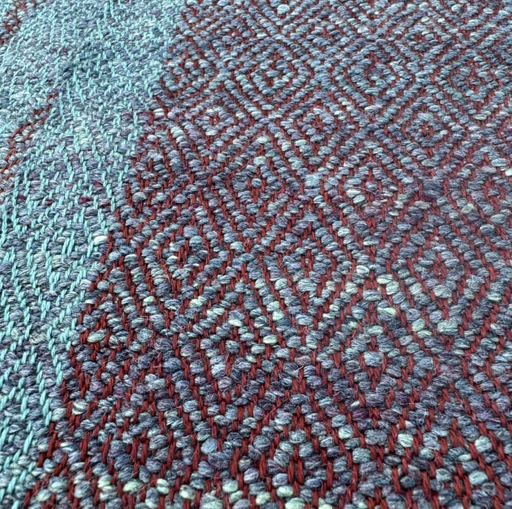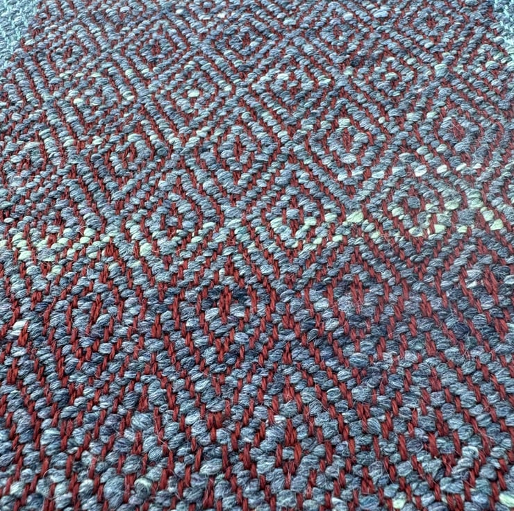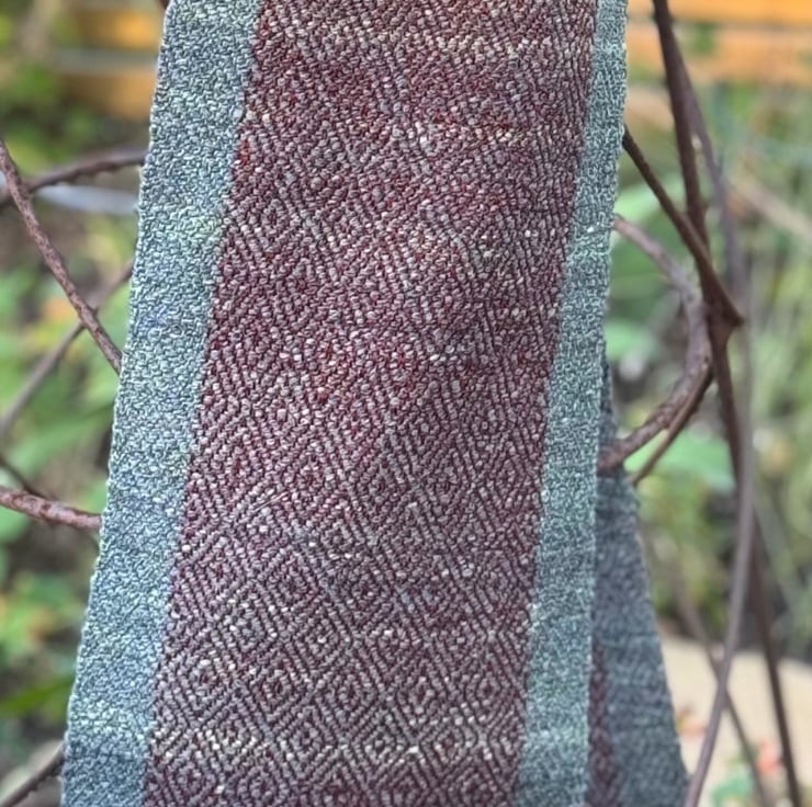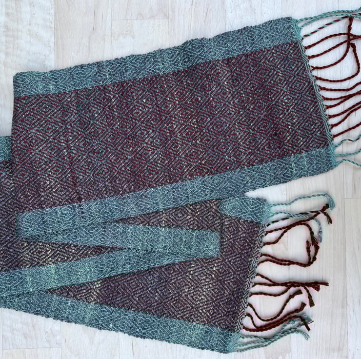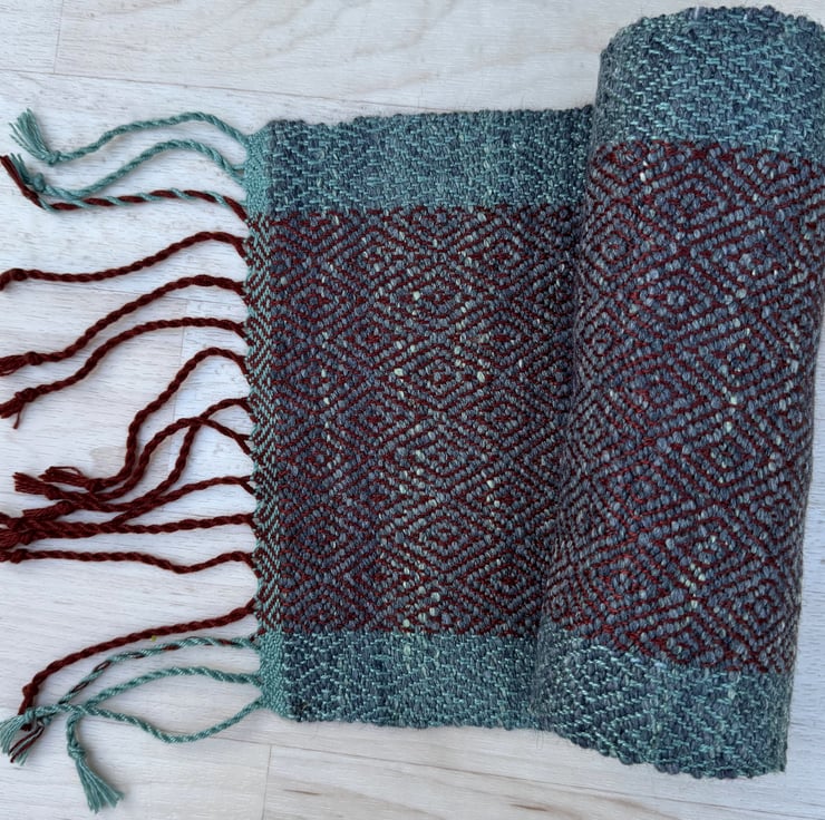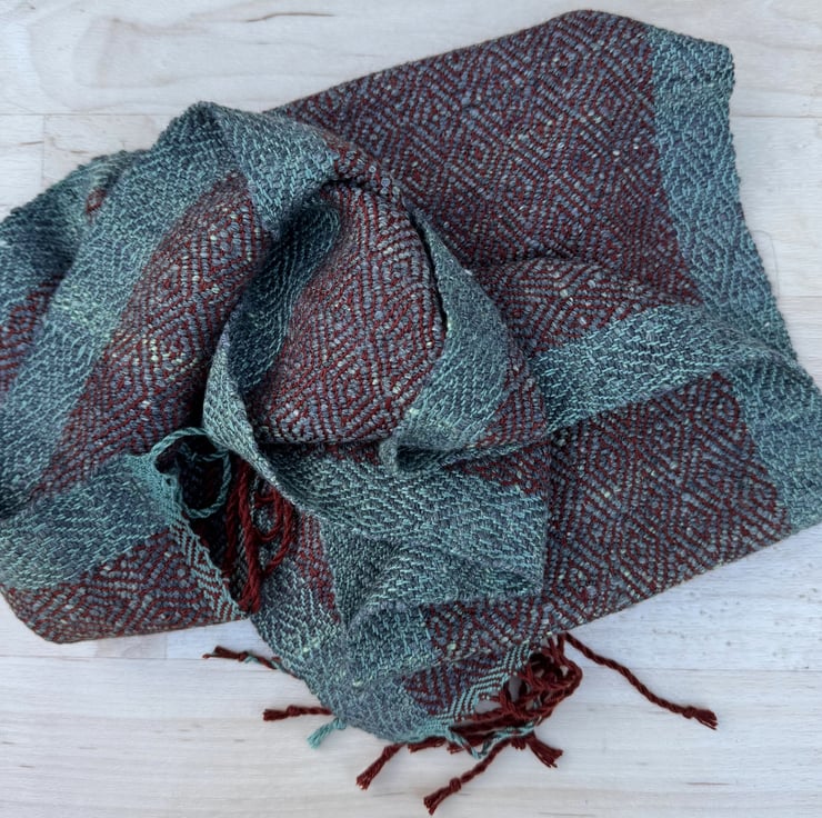 This warm and soft winter scarf has been hand-woven in a trellis pattern of elongated diamonds.The weft is deep grey, speckled with flashes of pistachio green; this was hand-spun from a mix of mainly merino and blue faced leicester wool, with elements of soya silk and bamboo that reflect the light. The warp uses tencel, with a broad central region in a deep rust red, edged to each side with a 3cm margin of mineral green. The scarf is 144 x 21 cm (excluding tassels). Wash at 30 degrees, line dry and press with a cool iron