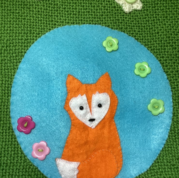 Fully lined with applique fox design in felt with button flowers on acrylic green yard bag.