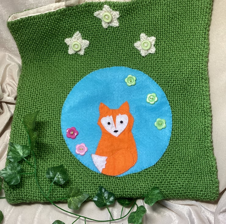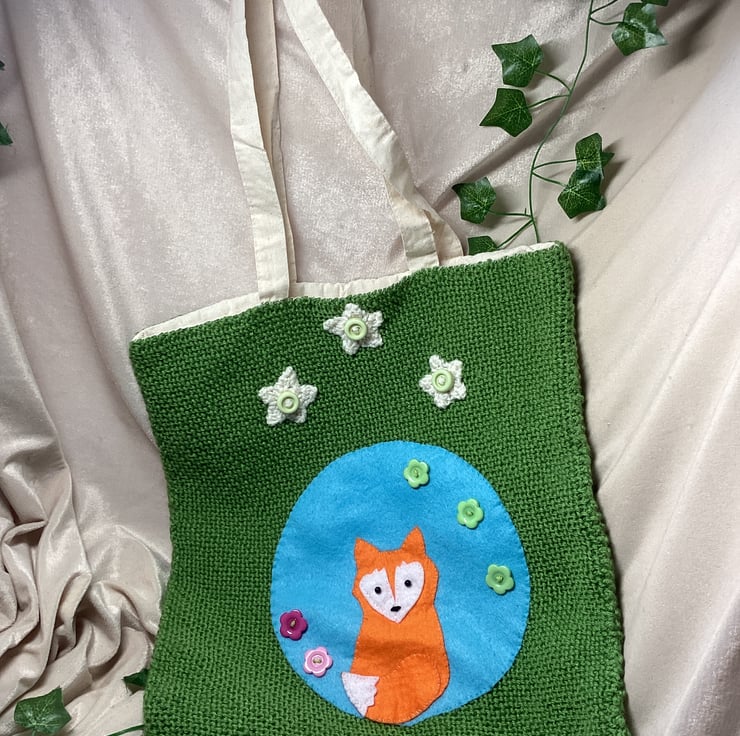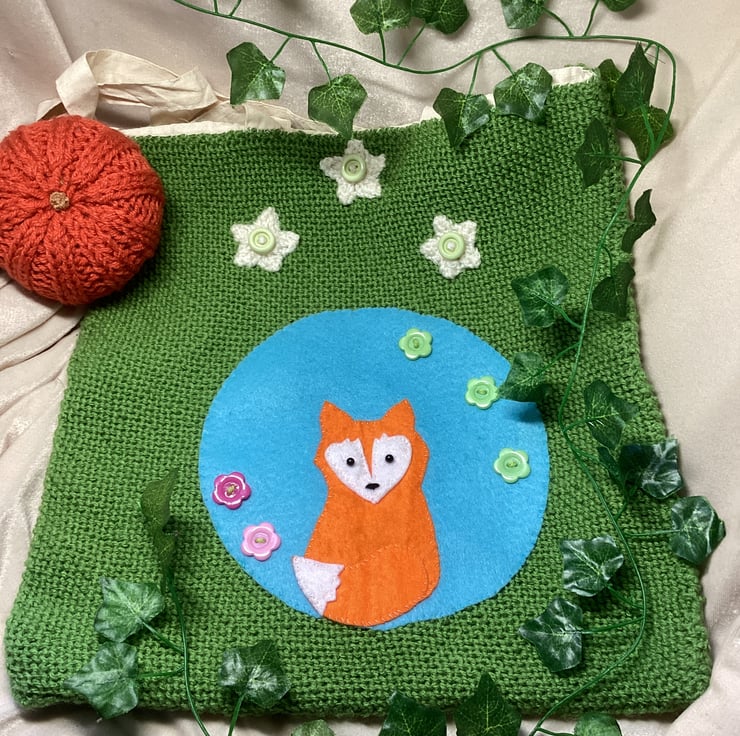 Hand Knitted Green Tote Bag with Applique Felt Fox Design. OOAK Free Postage.