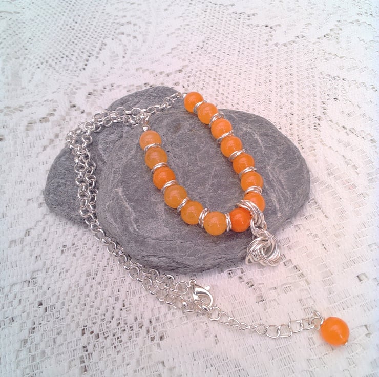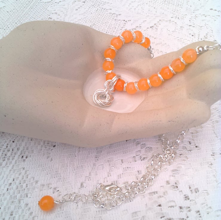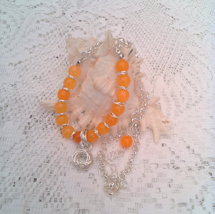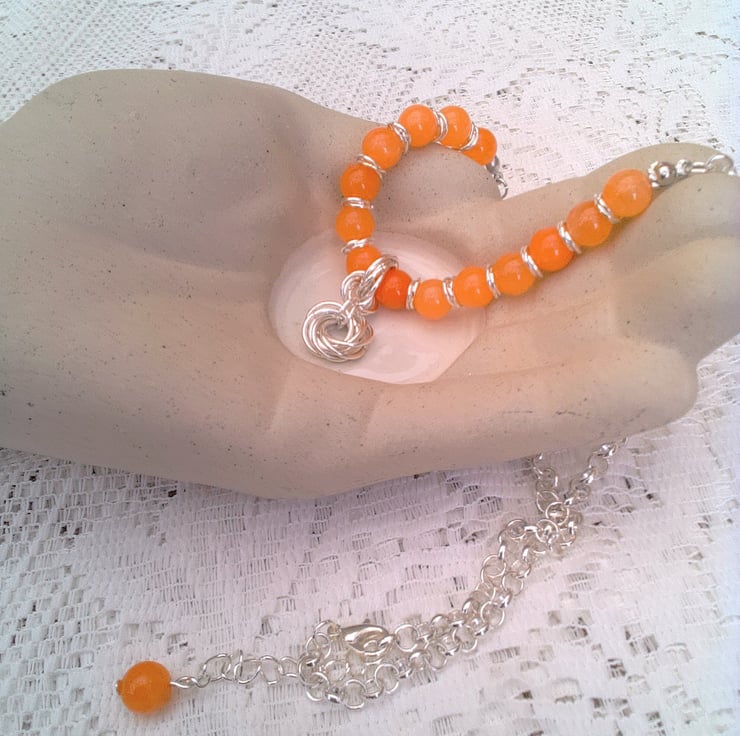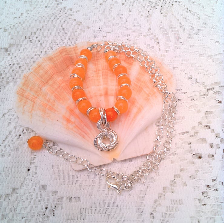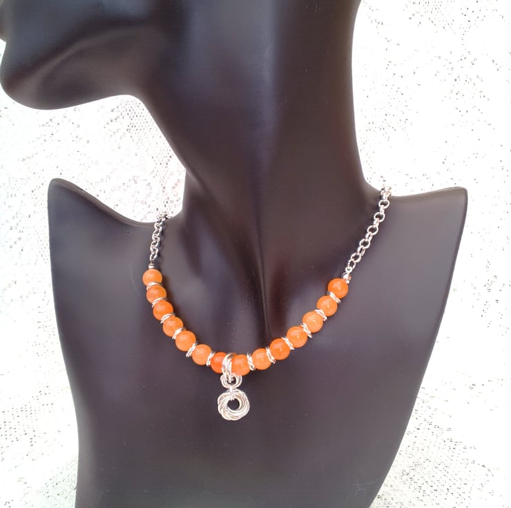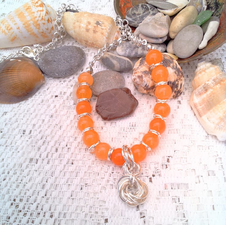 This striking orange carnelian gemstone bead and mobius component necklace would look great with any outfit you wear for a day out or for a casual evening out. It would also make a lovely gift for a friend or relative for a birthday, anniversary or Christmas, for a stocking filler or a Secret Santa, it would also be a lovely treat for yourself. It is made using 8 mm round orange carnelian beads and three 7 mm jump rings mobius components and silver plated rolo chain, with a pendant made with three sets of seven 10 mm jump ring mobius components. The beaded section of the necklace measures 5 inches (13.5 cm) and the chain section is 6.25 inches either side with an extender chain of 2 inches (5 cm) giving an overall length of 17.5 inches (44.5 cm) in total. The necklace will be dispatched wrapped in tissue paper in an organza bag and delivered to you via Royal Mail first class post
