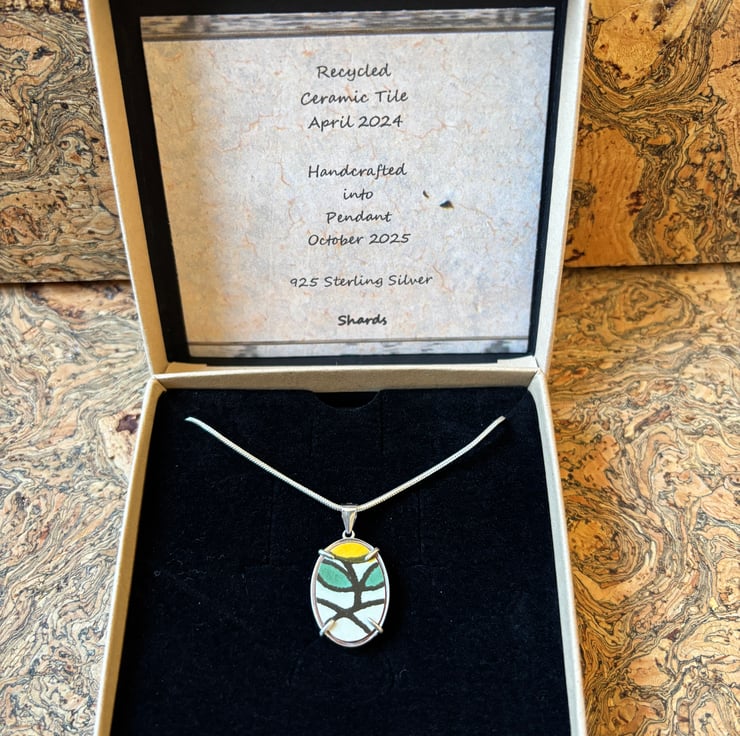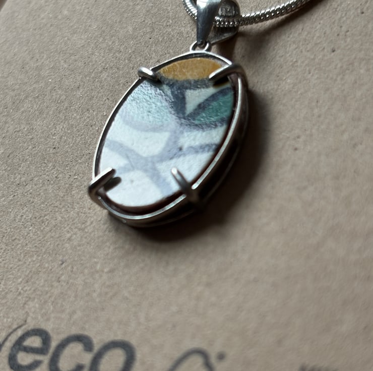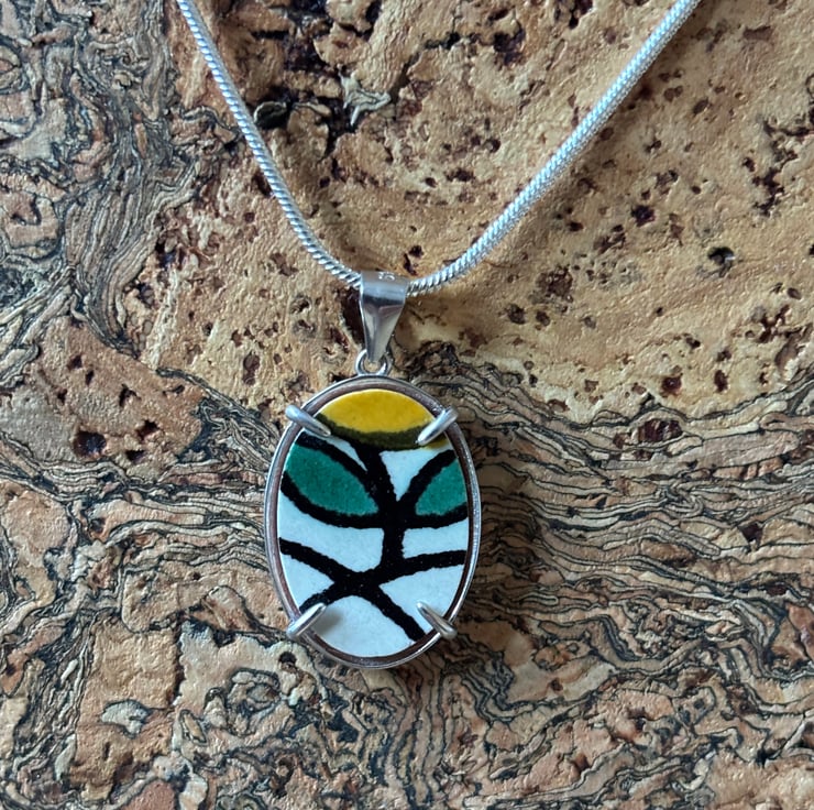I managed to create this pendant from the pattern which ran around the edges of one of the tiles. The final piece is abstract and set into an open back claw bezel made from recycled sterling silver. Usually this type of bezel tray is used for more 3D settings but I like the way the shard of tile sits flat held by the four claws.