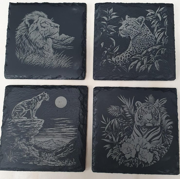 4-Piece Laser-Engraved Big Cat Slate Tile Set - Lion, Tiger, Leopard & Panther - With Free Wooden Storage Box