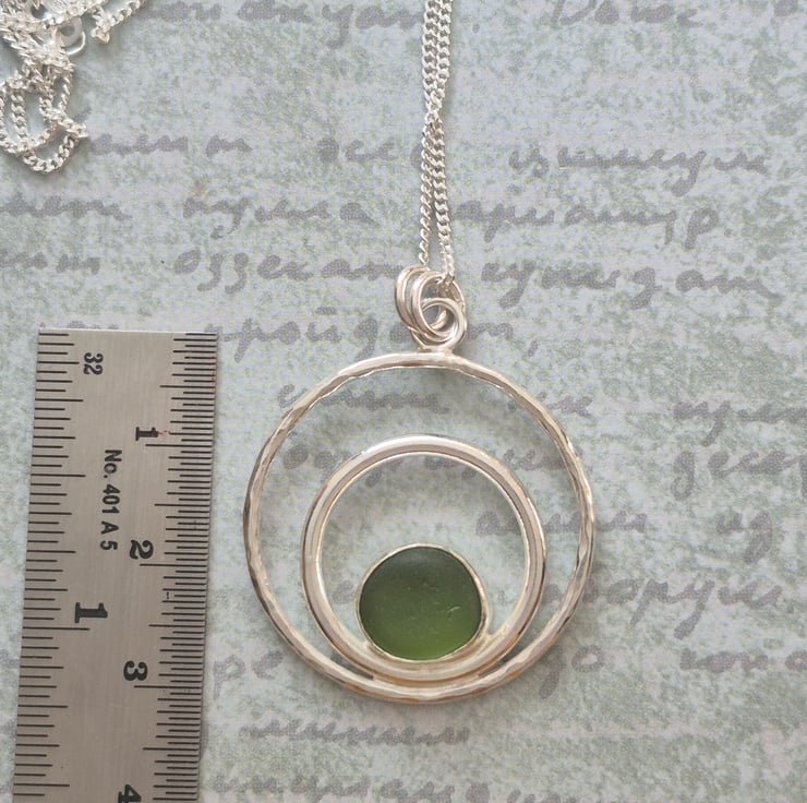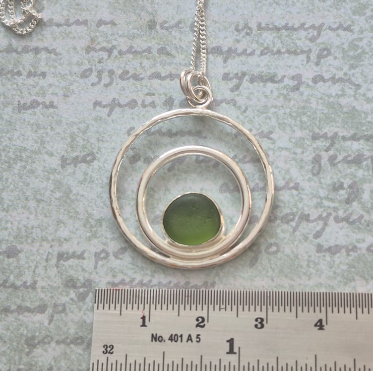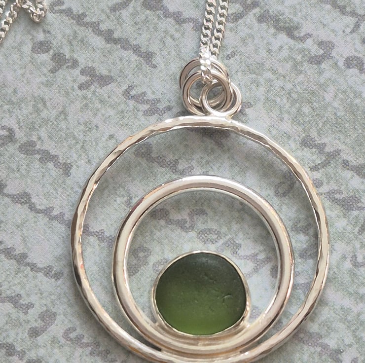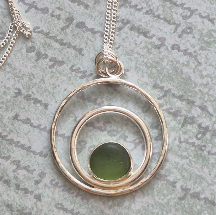 Beautiful Double Circle Textured Pendant Olive Seaham Seaglass Necklace Sterling Silver 925