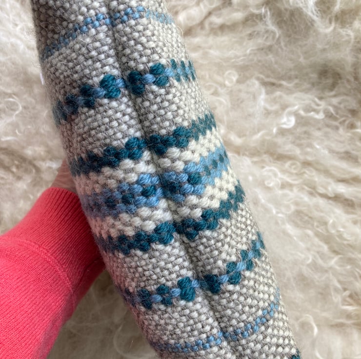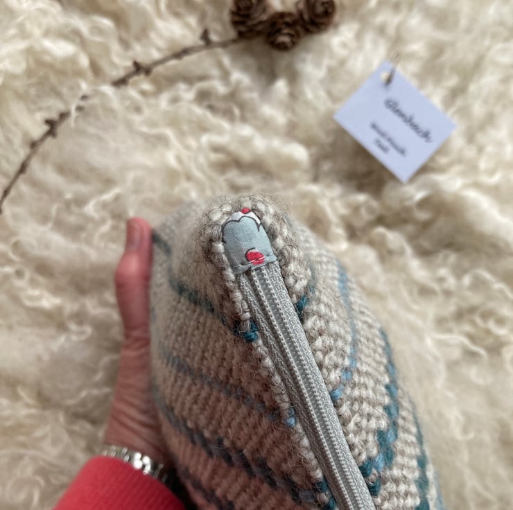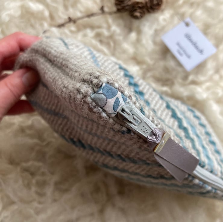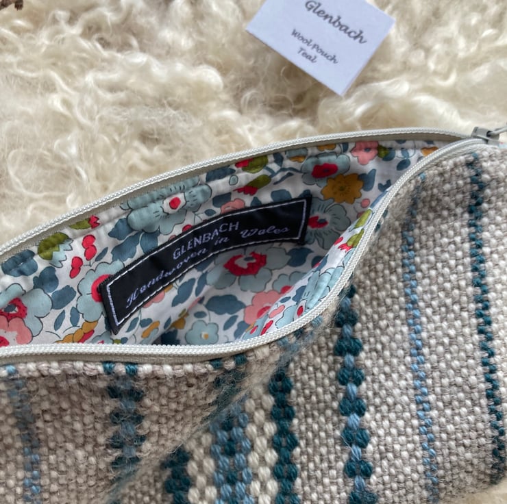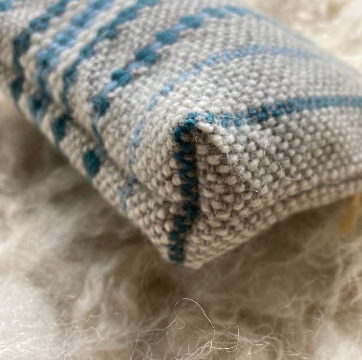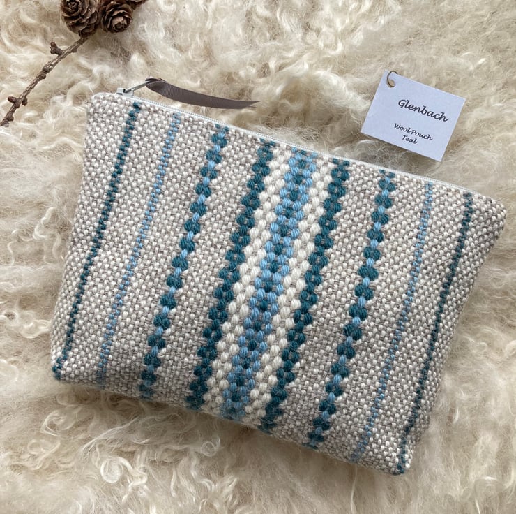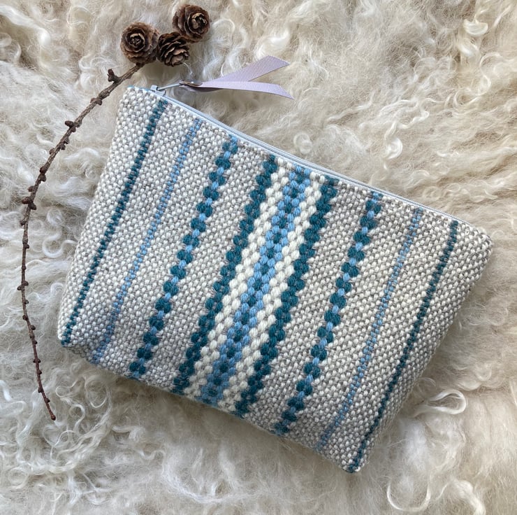 Our Wool pouch is handwoven using natural grey and ecru wool with a contrast of teal and pale blue - all British wool.