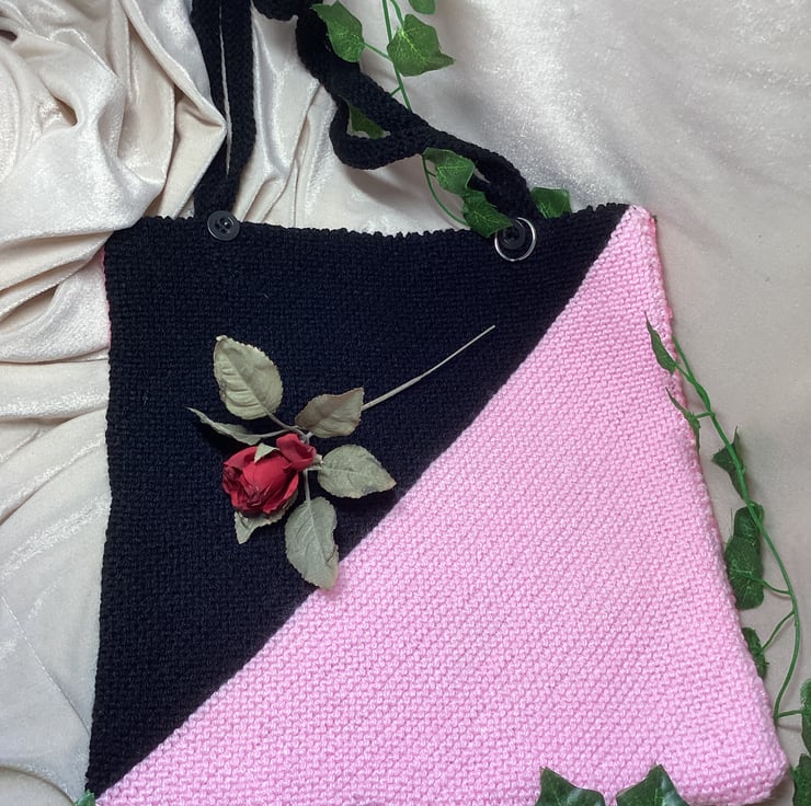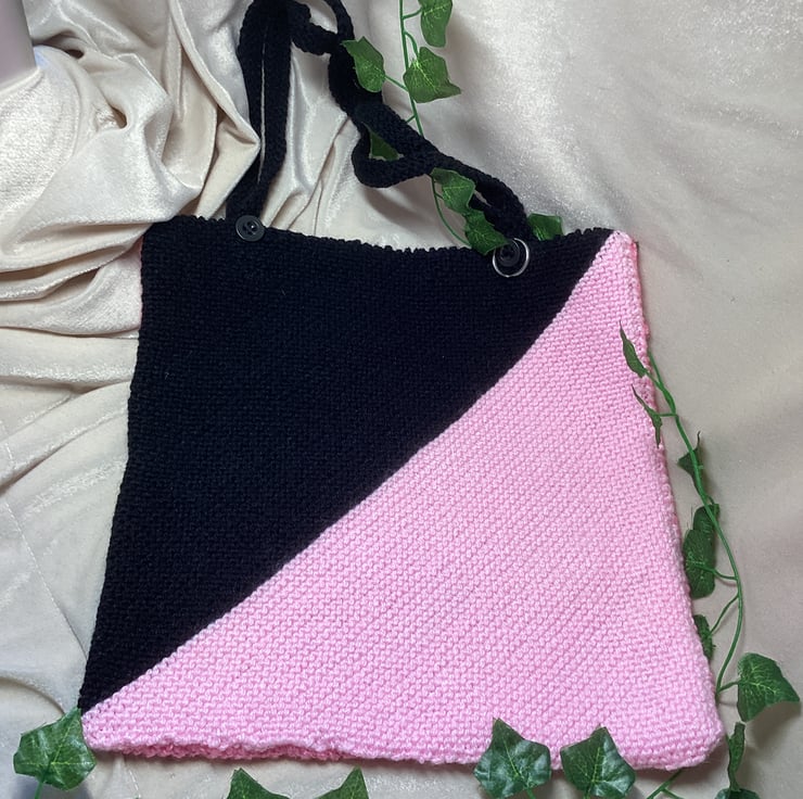 Hand Knitted Black & Pink Half and Half Tote Bag.