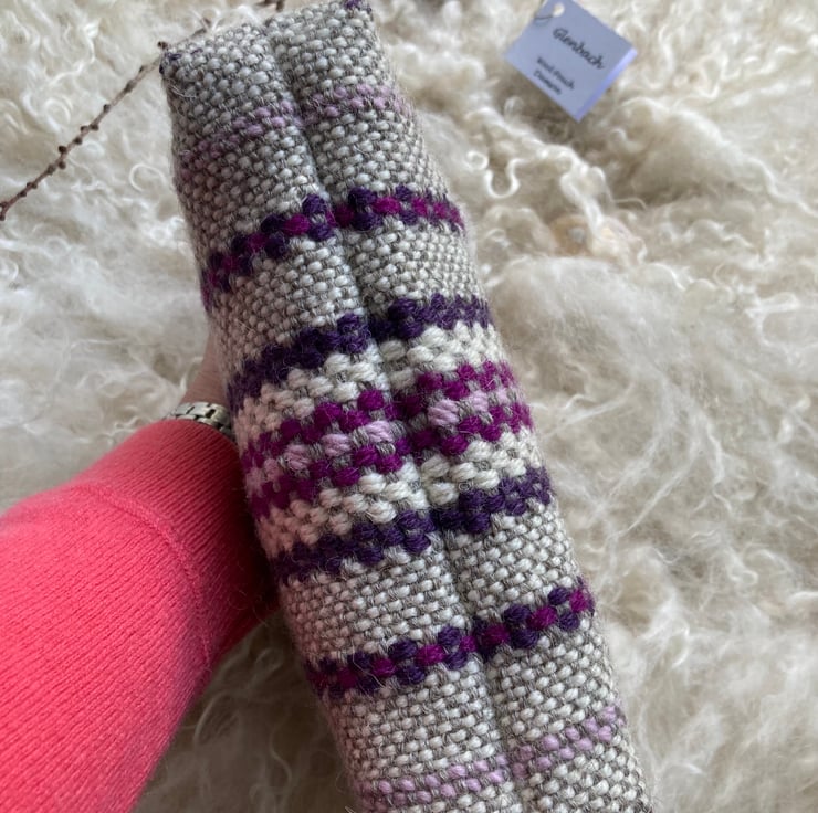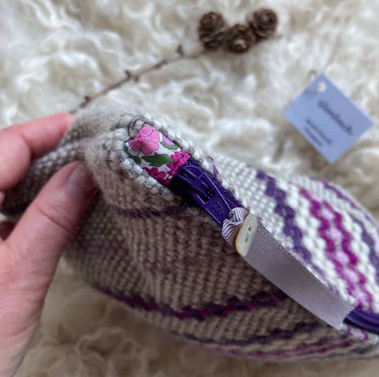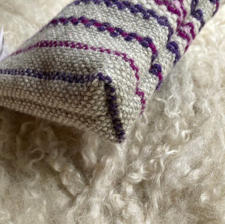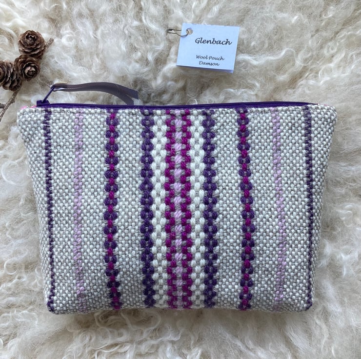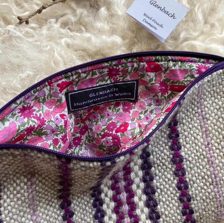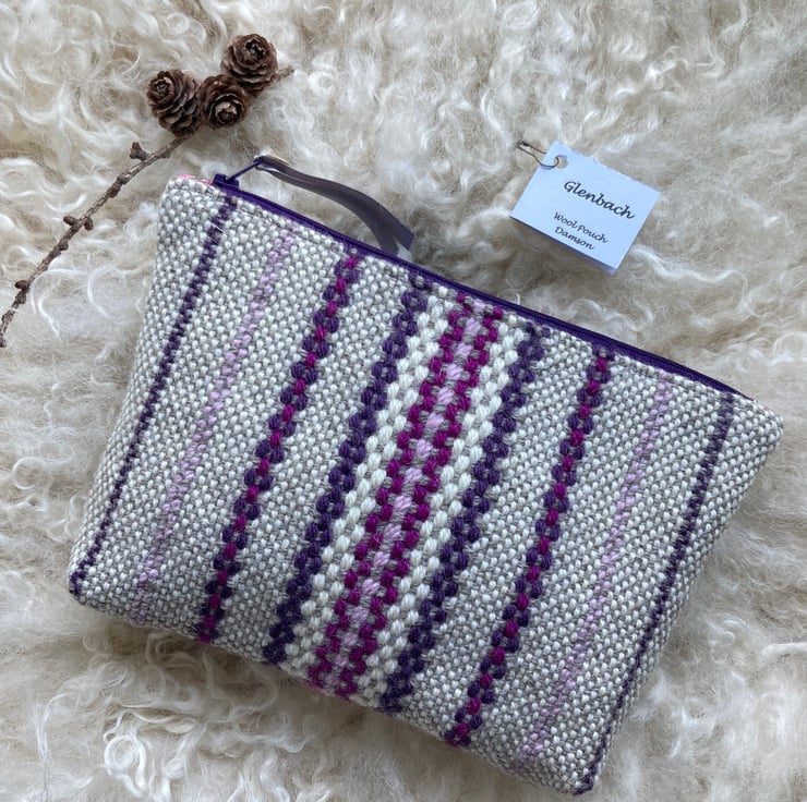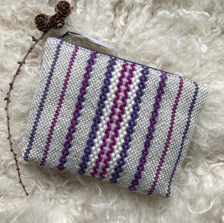 Our Wool pouch is handwoven using natural grey and ecru wool with a dash of damson, purple & pastel pink - all British wool.