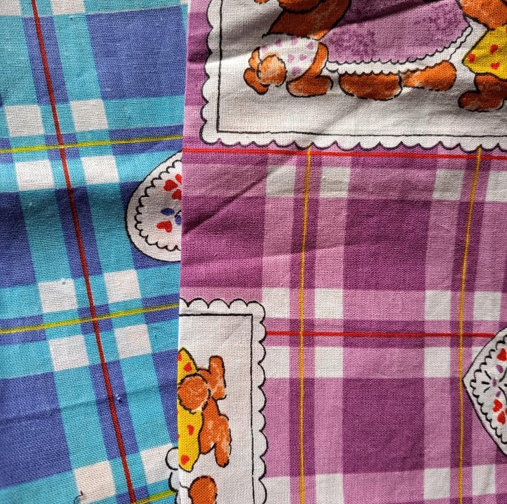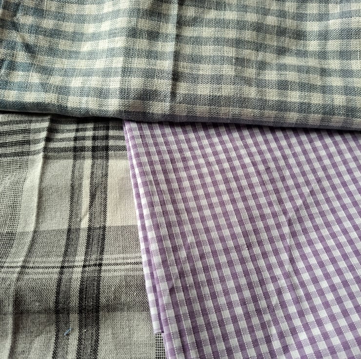 For the squares among you, here's a big bundle of checked fabrics, including cottons, linens and even a large piece of school dress purple gingham. Eleven pieces of varying sizes, ideal for those homespun projects.