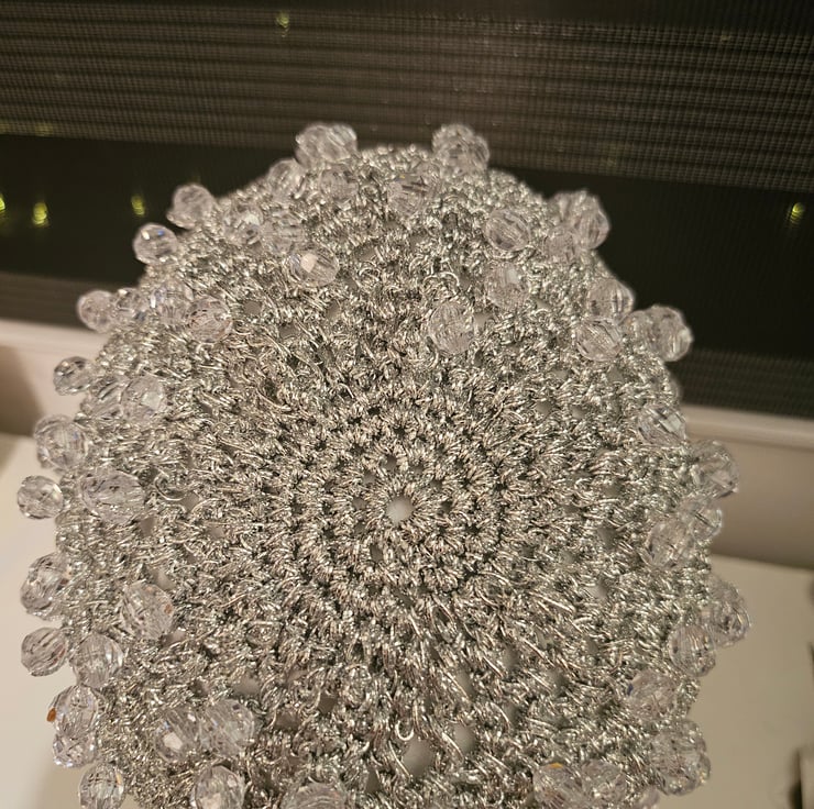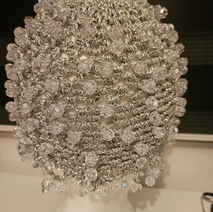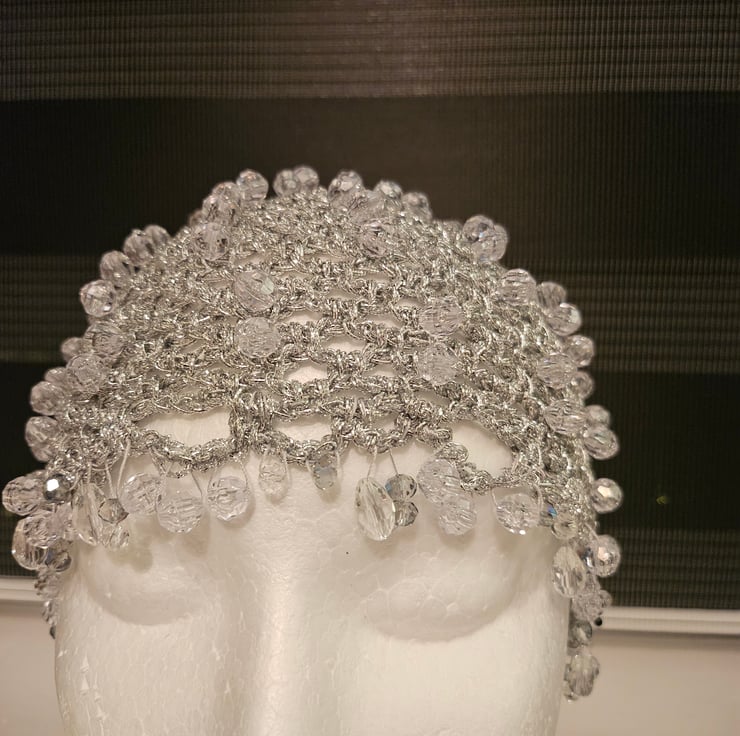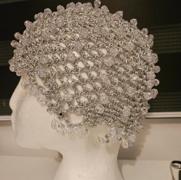 This 1920s style beaded beanie hat is crocheted using fine metallic silver elastic, metallic silver thread abd grey thread. There are over approximately 100 clear acrylic beads which are crocheted into the hat rather than sewn on.