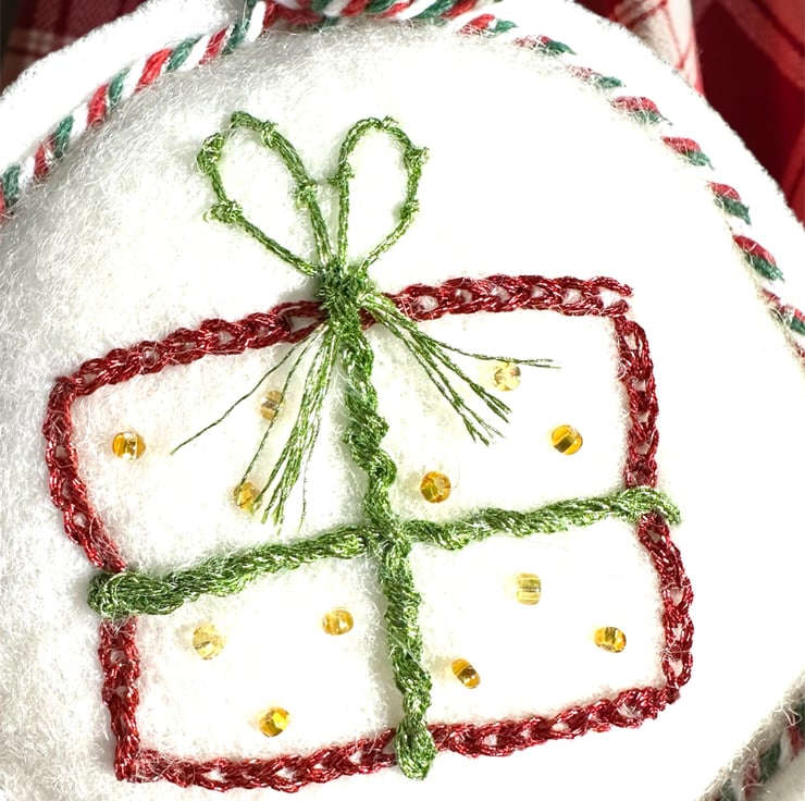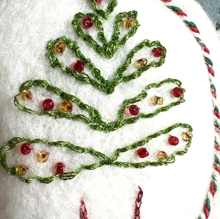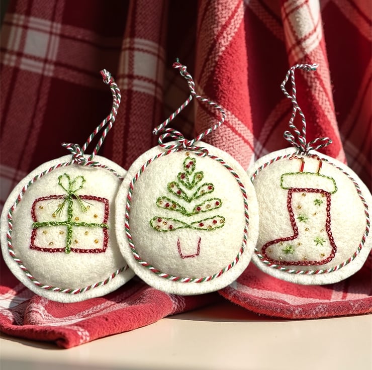 Hand cut from natural white wool felt and embroidered free hand. The tiny stitches using DMC shiny metallic threads and tiny glass seed beads add a sparkle. Festive red, white and green Christmas cotton string encircles the baubles then forms a bow and the hanger for the decorations.