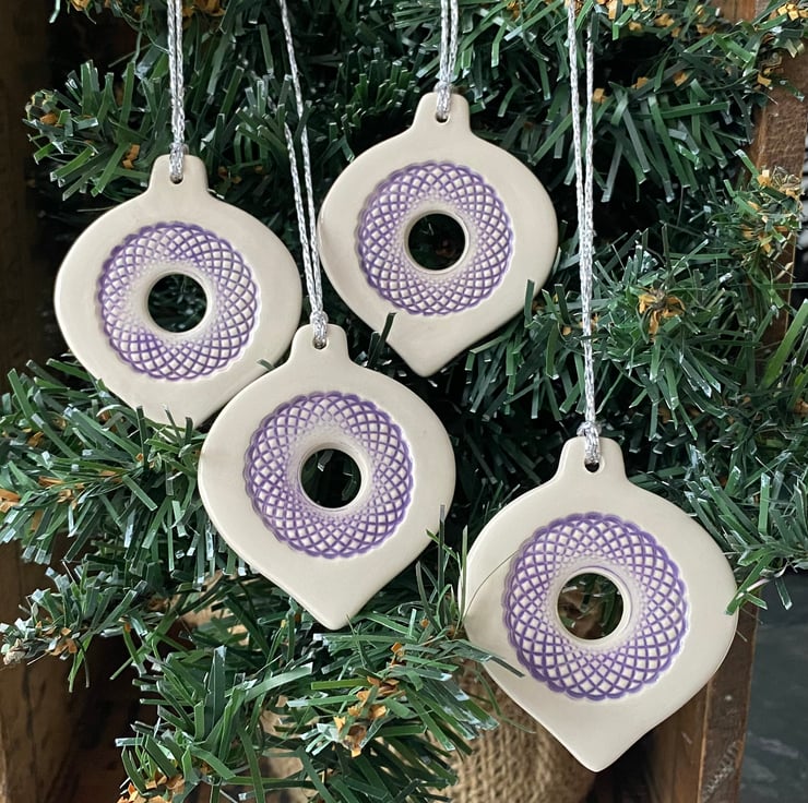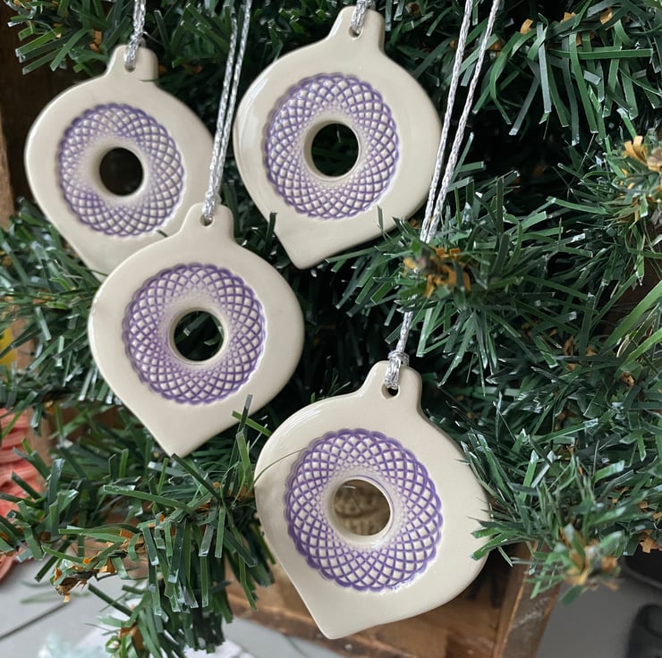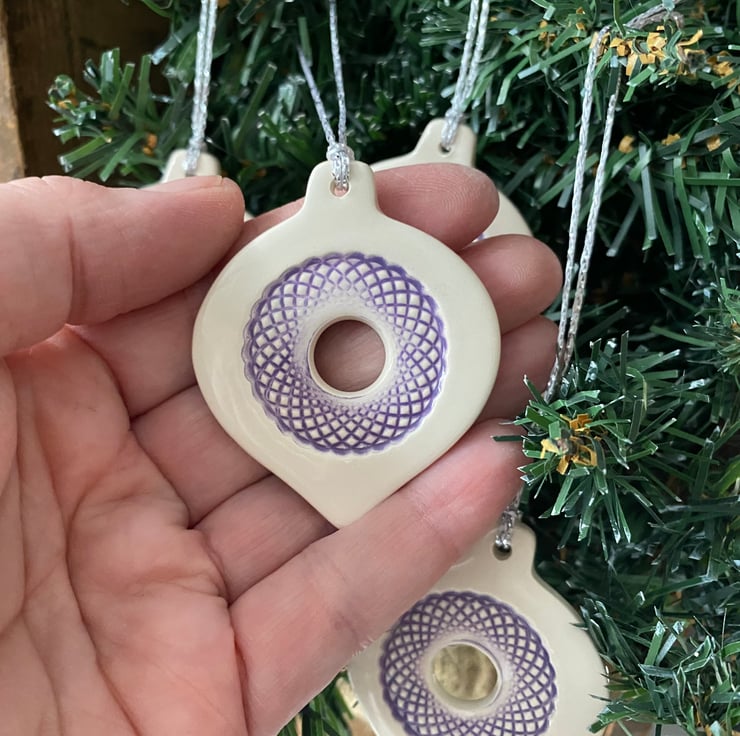 These bauble decorations are made from white earthenware clay but have been rolled out very thinly making them very lightweight. They have been imprinted with pattern, colour added and then fired twice. They measure 5.5 x 4.5cm.