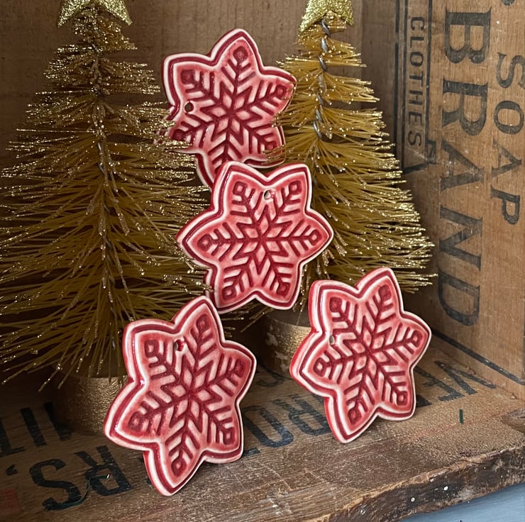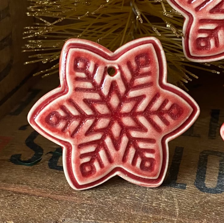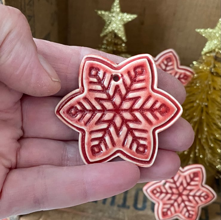 These snowflake decorations are made from white earthenware clay but have been rolled out very thinly making them very lightweight. They have been imprinted with pattern, red glaze added and then fired twice. They measure 4.5 x 4.5cm.