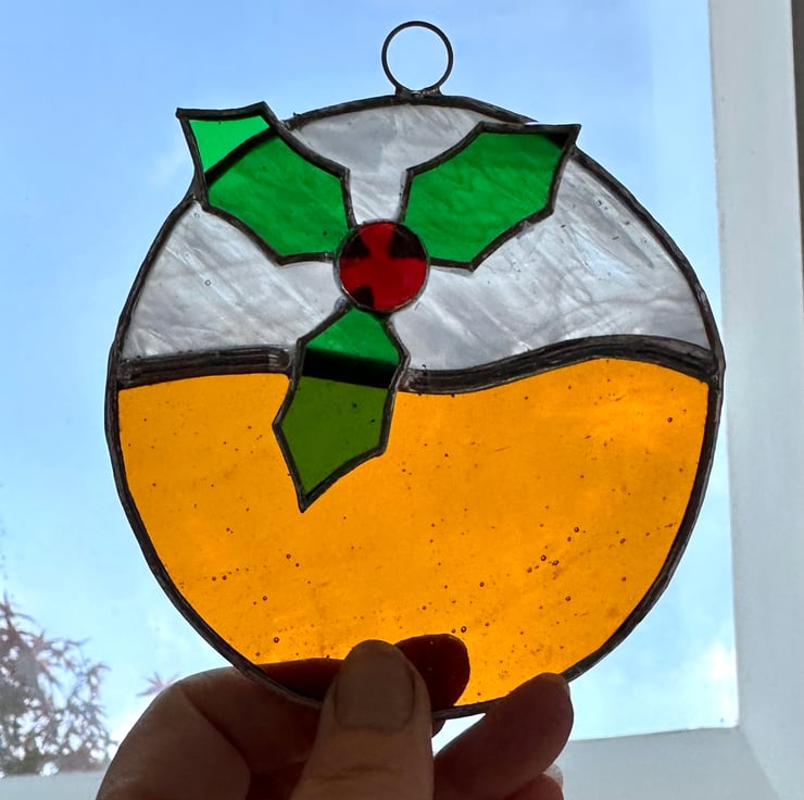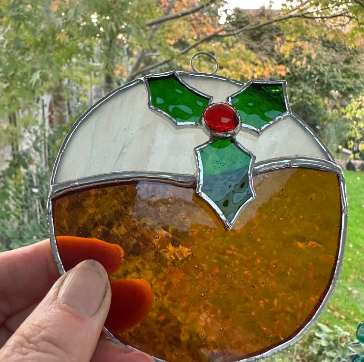Here’s a traditional Christmas pudding made using stained glass. I have used amber and streaky white sea glass for the pudding and Christmas green textured glass for the holly leaves with a red glass nugget for the berry.