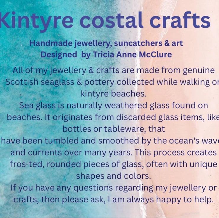 All of my 'treasures' Sea glass and sea pottery are natural, genuine pieces washed up on the Kintyre coast. I only use the best quality pieces for creating my jewellery. The other beach finds I use for crafting wall art, sun catchers, keyrings and book markers.