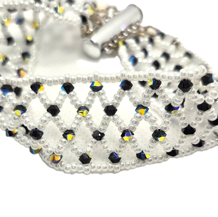 This bracelet has been created with white seed beads and sparkly Swarovski crystals in a netted cuff style